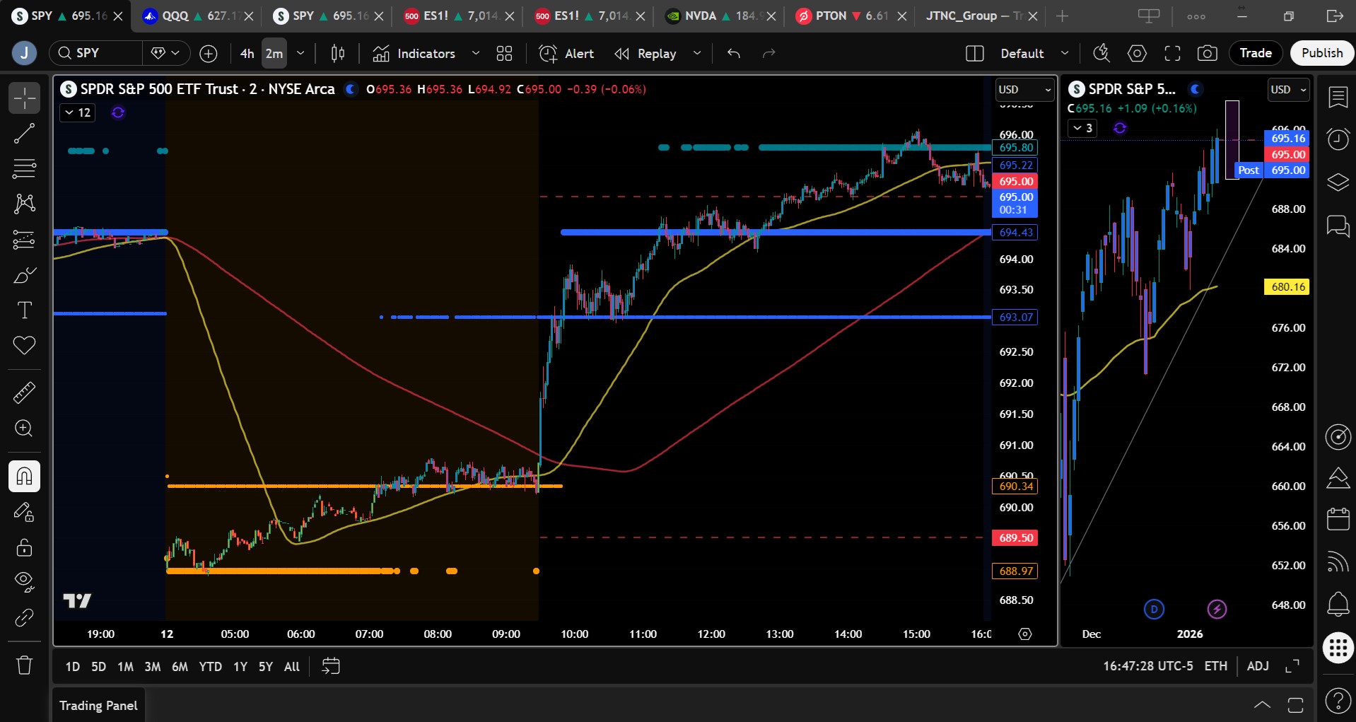 Monday’s action aligned with that outlook. SPY held above $690 throughout the session, absorbed selling pressure efficiently, and pushed to new all-time highs without a meaningful breakdown attempt. The absence of downside follow-through confirmed that bullish control remains intact.