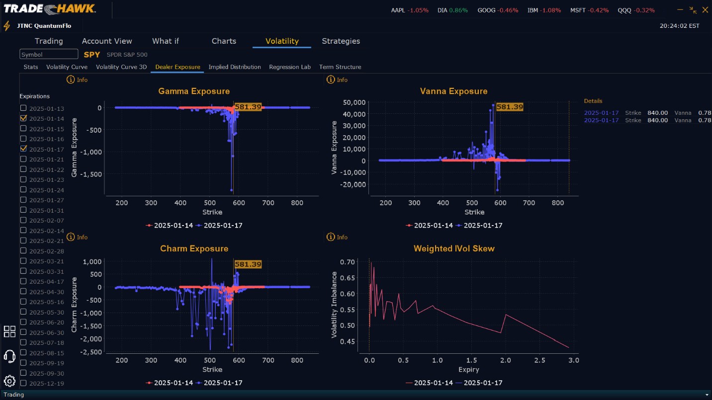 Dealers are selling $593 to $610 and higher strike Calls while buying $582 and $592 Calls indicating their desire to participate in any market rally to as high as $610 by the end of the week. $605 appears to be the ceiling for the week. To the downside, Dealers are buying $581 to $550 and lower strike Puts in a 5:2 ratio to the Calls they are selling/buying, reflecting a slightly bearish view for the week. This positioning remains unchanged from today although Dealers continue to add significant quantities of protection which implies a fear of falling prices. Dealers are prepared for any market decline that may develop, but again, this positioning is not overly bearish at 5:2. Should we see the Dealers with a 5:1 ratio or greater, we would be very concerned about lower prices. But Dealer positioning changes daily so it’s essential to monitor these updates each day for shifts in sentiment.
