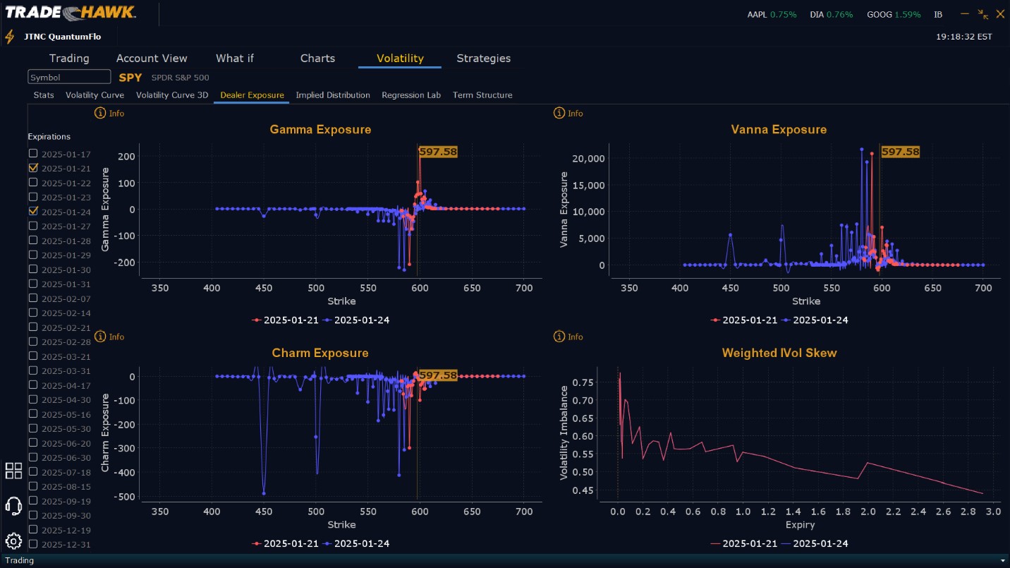 Dealers are selling $598 to $610 and higher strike Calls while buying $594 to $597 Calls indicating their desire to participate in any market rally to as high as $610 by the end of next week. $605 appears to be the ceiling for the week, however. To the downside, Dealers are buying $593 to $560 and lower strike Puts in a 4:1 ratio to the Calls they are selling/buying, reflecting a bearish view for next week. This bearish posture remains the same as today but with less strength than the 6:1 ratio coming into the day. While not overly bearish, above 3:1 Dealers are showing some concern over lower prices. Dealers have reduced some of their protection but that may also be as a result of monthly OPEX. Dealers are certainly prepared for any market decline that may develop and we suggest any long book take the opportunity to do the same. Dealer positioning changes daily so it’s essential to monitor these updates each day for shifts in sentiment.