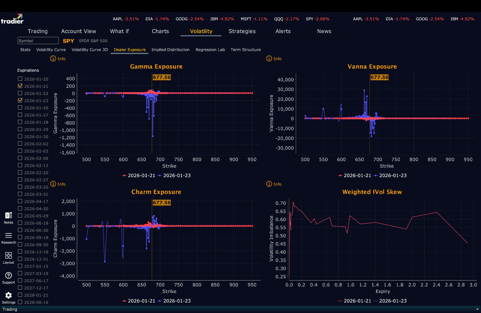 SPY’s projected maximum range for Wednesday is $669 to $686. The Put side dominates in a wide and expanding band, signaling trending action with periods of chop. Wednesday features the Davos World Economics Forum all day, with President Trump speaking in the premarket, and it would not be surprising to hear global leaders voice concerns over U.S. policy on Greenland and tariffs, which could add to volatility. SPY fell more than 2% today to close at $677.58, returning to the $675–$685 range that has acted as a price magnet for several weeks. The market appears to be running low on momentum to push to new highs, though it is still unclear whether this marks the start of something more ominous. While 2% down days are rare, they do occur, and after the massive rally from April, the market has been due for a pullback. Much of today’s weakness occurred overnight as markets reacted to renewed geopolitical tension tied to the administration. SPY attempted to bounce, and it briefly looked like the overnight dip to $680 might hold and allow a move back above $685, but that failed as former support turned into resistance. By noon, SPY began drifting lower and continued to do so until reaching $676, where a modest bounce into the close lifted price slightly. Volume was nearly double the daily average, which does not bode well for the bull trend. Still, as long as price remains within the $675–$685 range, the bulls retain the long-term edge, although the bears are clearly becoming more active and currently hold the near-term advantage. Bears will try to keep price trapped in this range and ultimately break it to push toward lows not seen since last month. It is worth remembering that SPY tested $670 on December 17 before bouncing, suggesting there may be more downside before a durable bottom forms. Overnight, the market is likely to retest today’s lows, and if they hold, a relief rally could follow with an attempt to reclaim $680 and possibly $685. If today’s lows fail, SPY is likely to test and potentially break the December low, with $650 as a realistic bear target. As we have stated for months, the long-term trend remains intact above $640, meaning even a move to $650 would likely be a buy-the-dip opportunity for bulls. We have also warned that February is notorious for surprise selloffs, so a deeper decline would not be shocking and should be viewed as a potential setup for a spring or summer rally. Traders should closely monitor geopolitical headlines and trade what they see. Absent a catalyst, resistance for Wednesday sits at $679, $680, $684, and $685, while support is at $675, $671, and $668. The $680 level is heavily defended up to $685 and is likely to cap upside, while a sustained break above $685 would put the bulls back firmly in control. Failed-breakdown longs near $675 remain viable, but only after price falls and clearly recovers. Shorts are favored on tests between $680 and $685, and any longs before $680 is reclaimed are unwise. Selling bounces is the preferred approach for Wednesday, and a clean break and hold below $675 presents an opportunity to get short and stay short. Crypto sold off sharply today, dropping nearly 5%, and every MAG stock declined, led by Nvidia down more than 4%. We have said for weeks that broad weakness across both groups is required for a larger pullback, and today marks day one, with attention now on whether days two and three follow. VIX jumped 6.63% to 20.09, returning to warning territory and signaling increased risk. SPY also broke below the lower channel of the bull trend from the April lows, with former support at $685 now acting as resistance.