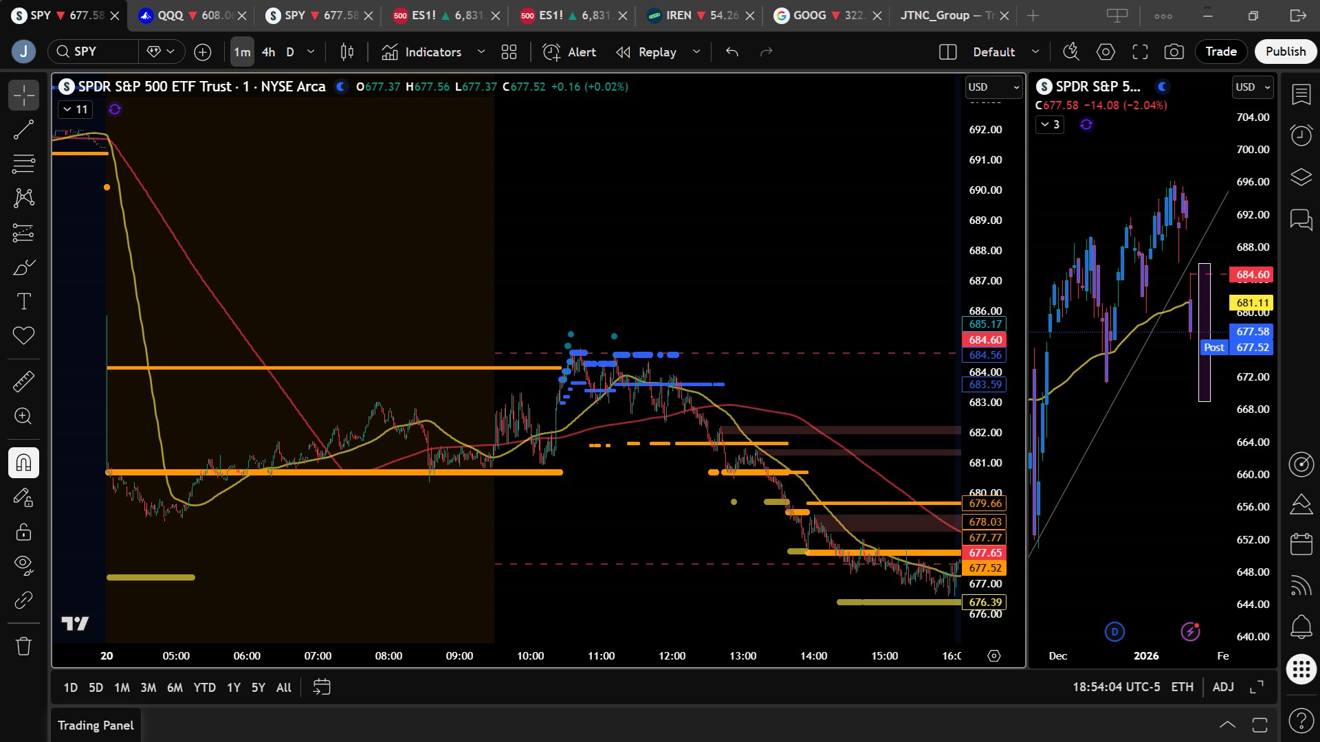 In Wednesday’s premarket notes published at 7:01 AM, SPY was trading near $676.39 with upside targets at $677, $680.20, and $681.85, and downside levels at $675 and $670. We noted that a recovery would require sustained intraday buying and cautioned against overly aggressive downside expectations given the market’s potential to rally sharply.