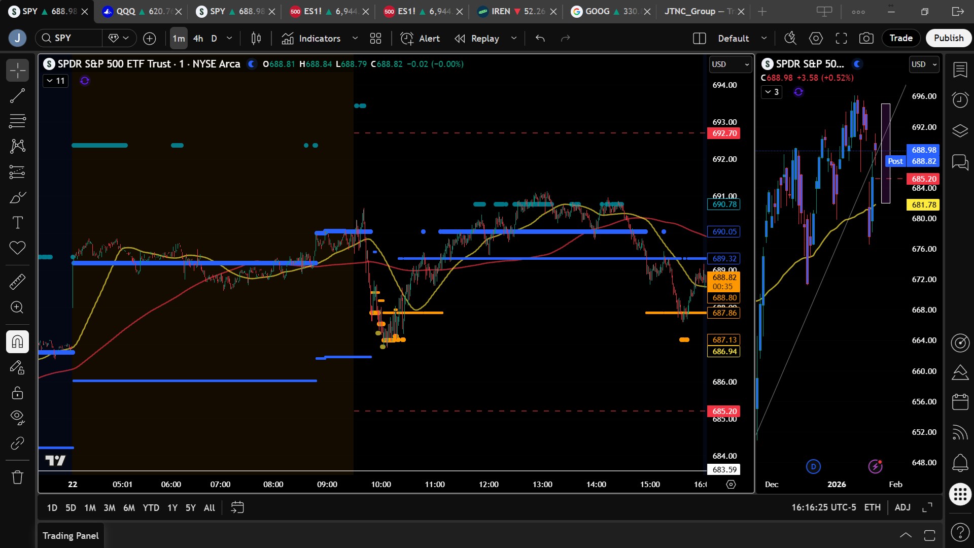 The intraday tape validated that outlook. SPY held above the $688.20 bias, probed higher toward $691, and consolidated without triggering deeper downside targets. Selling pressure stalled well above the lower support zone, reinforcing the preference for consolidation rather than a renewed breakdown.