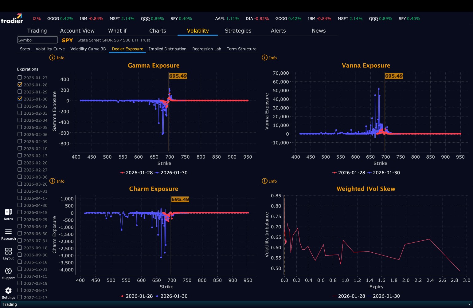 Dealers are selling SPY $696 to $720 and higher strike Calls indicating the Dealers’ belief that prices may not move much this week. The ceiling for the week appears to be $700 but there is also the potential to reach $705. To the downside, Dealers are buying $695 to $585 and lower strike Puts in a 4:1 ratio to the Calls they’re selling, reflecting a market that is a somewhat concerned about lower prices but not overly so. For the week Dealer positioning is unchanged from slightly bearish to slightly bearish. We advise reviewing Dealer positioning daily for directional clues. These positions evolve quickly and tracking them is essential for staying ahead of shifting market sentiment.