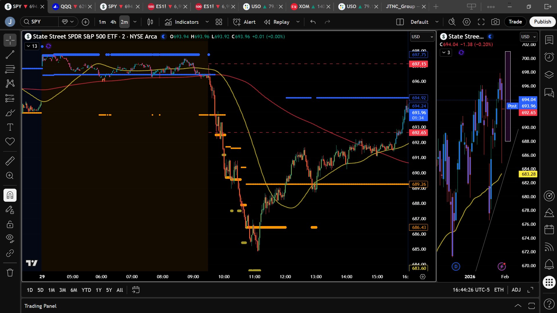 SPY experienced a volatile session marked by a sharp morning selloff followed by a steady afternoon recovery. The ETF opened at $696.22 and initially pushed higher overnight, but selling quickly took control after the open. Price fell steadily through the morning, briefly pausing near $690 before accelerating lower to an intraday low of $684.83. Buyers stepped in decisively at that level, triggering a slow, grinding rebound through the afternoon. SPY closed at $694.07, down 0.19% on the day. Trading volume surged to 92.51 million shares, well above average, reflecting heightened participation and elevated emotion. Despite the intraday drawdown of more than 1.5%, the close well above $685 once again reinforced that bulls continue to defend this level with precision.