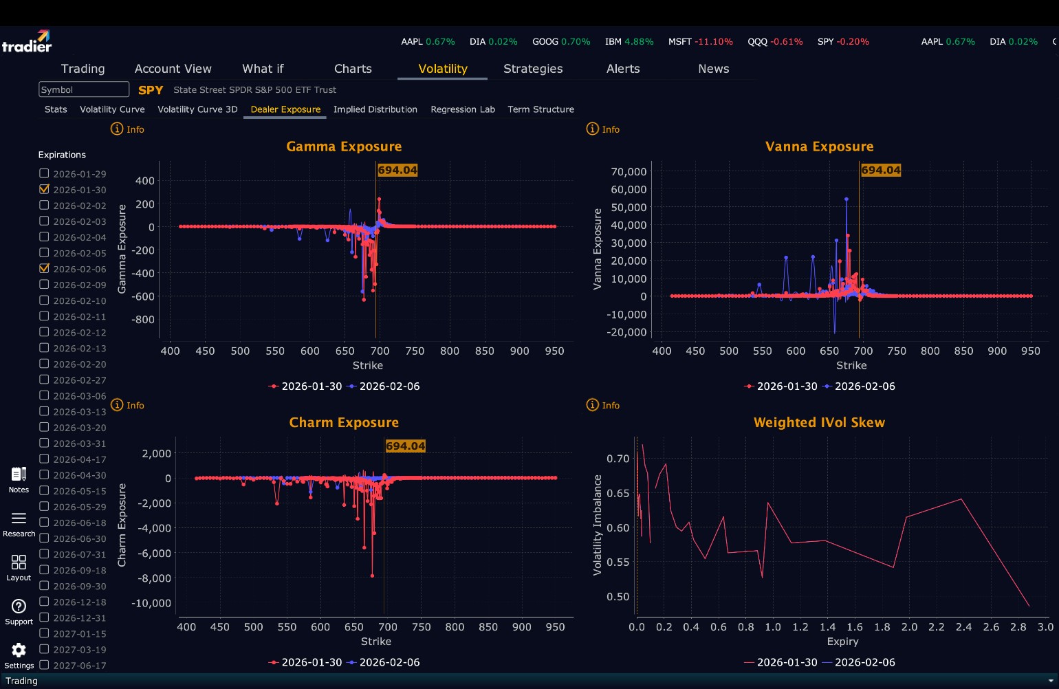 Dealers are selling SPY $696 to $720 and higher strike Calls while buying $695 Calls indicating the Dealers’ desire to participate in any rally next week. The ceiling for the week appears to be $705. To the downside, Dealers are buying $694 to $585 and lower strike Puts in a 4:1 ratio to the Calls they’re selling, reflecting a market that is a slightly concerned about lower prices but not overly so. For the week Dealer positioning is unchanged from slightly bearish to slightly bearish. We advise reviewing Dealer positioning daily for directional clues. These positions evolve quickly and tracking them is essential for staying ahead of shifting market sentiment.