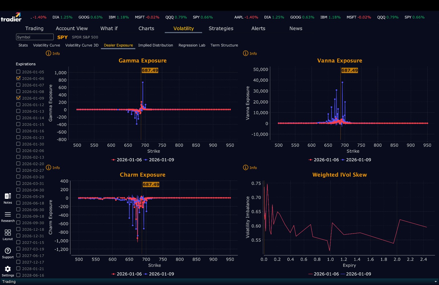 Monday’s action aligned well with that framework. SPY opened above $686, never tested $685, and pushed higher into the $689 area before consolidating. The ability to hold firmly above the prior range confirmed that the breakout remains valid and that bulls entered 2026 with clear control of the tape.