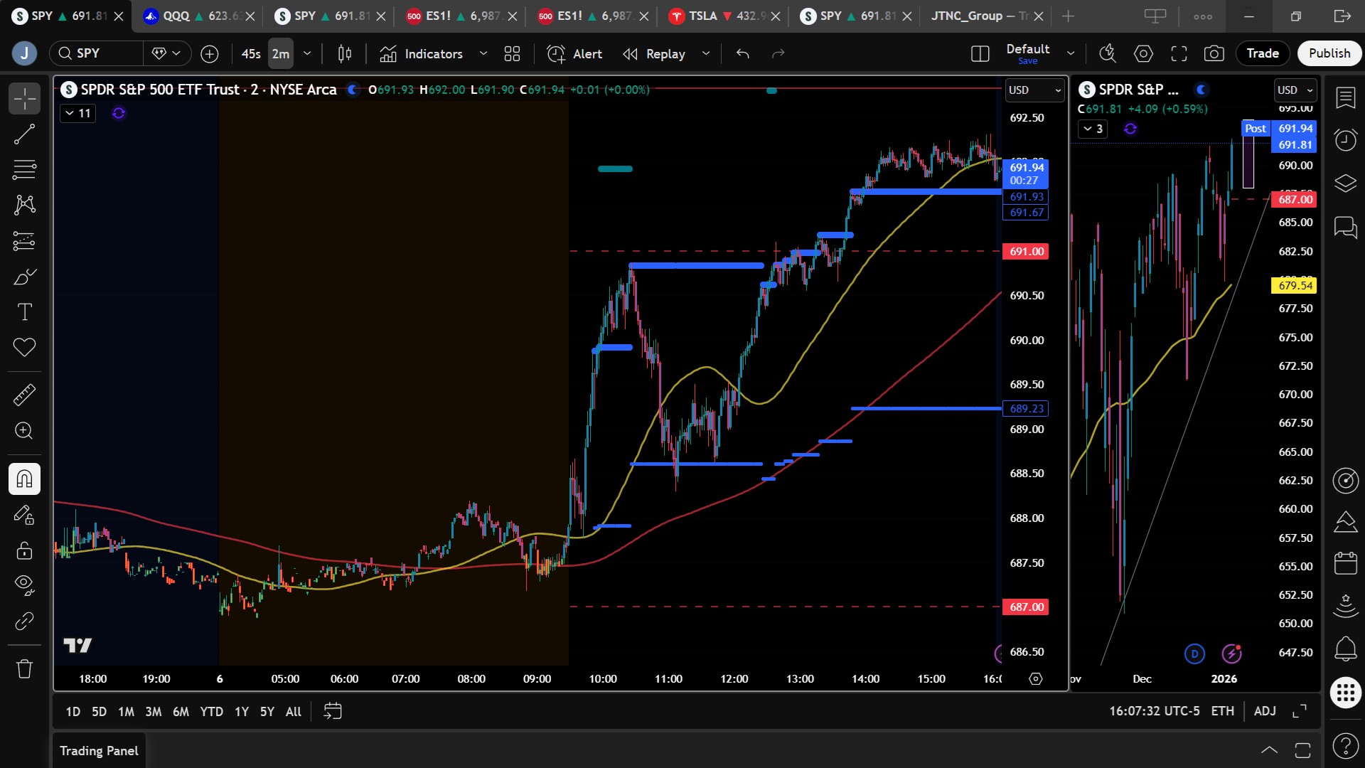 Tuesday’s action validated that framework. SPY held firmly above $685 from the open, broke cleanly through $690, and closed above that level, signaling stronger-than-anticipated follow-through. The absence of meaningful pullbacks reinforced the view that buyers remain firmly in control as 2026 begins.