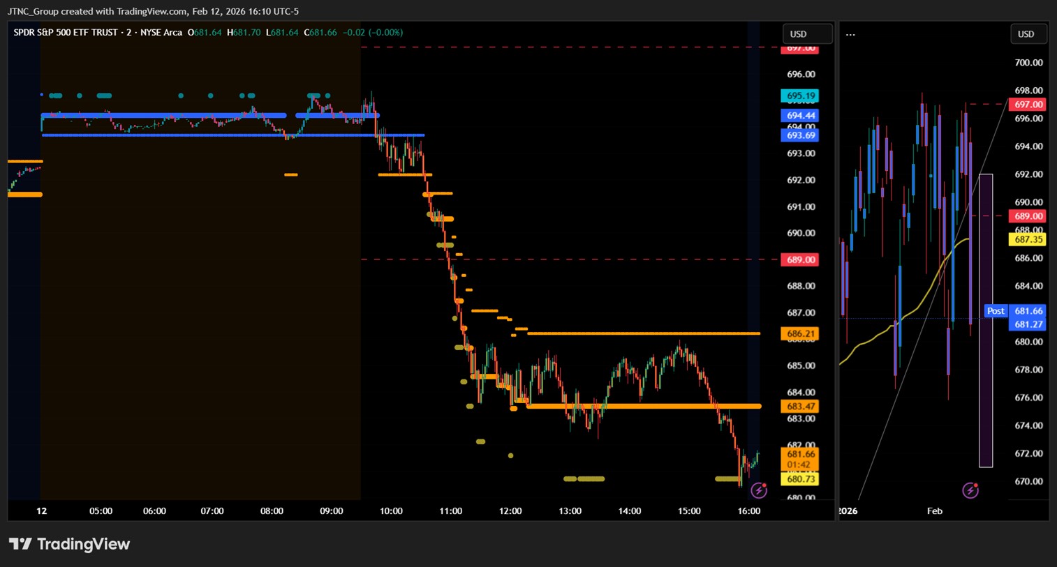 The session validated that roadmap. SPY failed to hold above $685 early, selling accelerated, and price extended toward the $680 area before stabilizing into the close. The breakdown occurred exactly as outlined in the premarket plan.