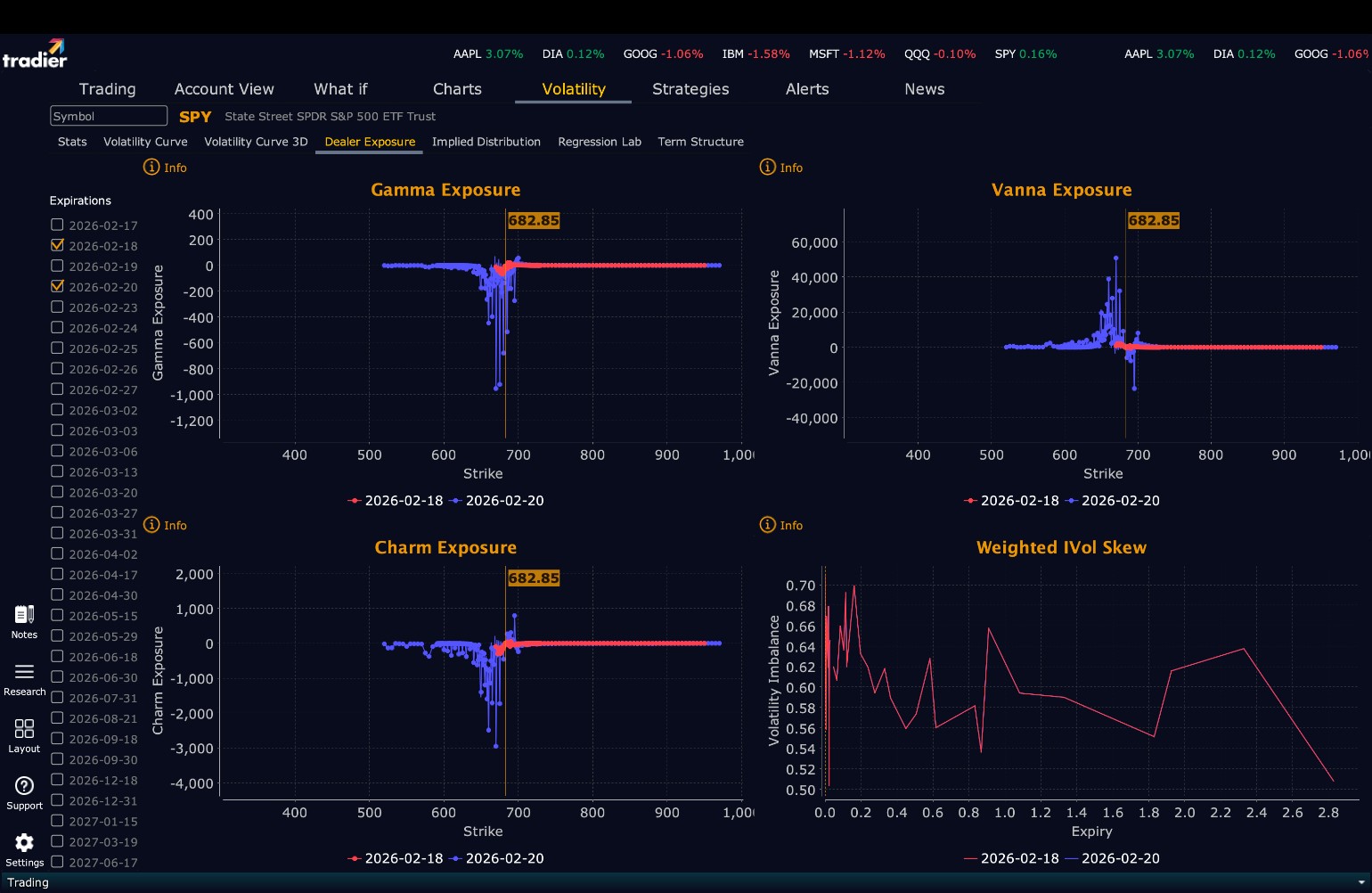 SPY’s projected maximum range for Wednesday is $675 to $691, with the Put side dominating in a narrowing range that suggests choppy price action with intermittent trending periods. There is no economic news due out tomorrow. SPY dipped on the shortened Monday trading session and came into the day down slightly, but by the end of the session reversed course to close up 0.16% at $682.85, slightly above Friday’s close but nothing significant. SPY tested last week’s lows at $676 which held again as price continues to trade in a wide $675 to $685 range similar to what we saw a few months ago. The market is likely to remain in this range, allowing the bears to stay in the game until an external catalyst breaks it. Wednesday is likely to deliver similar action as today, possibly even more muted with less trending and more sideways price movement. With SPY below $685, the bulls have the slight edge, and do not regain control until $685 is reclaimed. The long-term bull trend remains intact above $640, but new highs are off the table for Wednesday without an external catalyst. February continues to prove difficult for longs as we warned for several weeks, although sharp selloffs are often buying opportunities for a spring and summer rally. As long as price holds above key structural levels, this remains a broader dip-buying environment, but swing and intraday traders must stay focused on positioning and dealer flows which remain skewed short. Overnight the bulls need to hold above $682 to set up a push back above $685 to regain near-term control, although even a reclaim does not signal an all-clear as dealers are positioned for weakness up to $689. The $689 to $694 zone is likely to produce heavy chop and resistance before any clean directional move. The good news for bulls is that $676 appears heavily supported and may again serve as a temporary low. If $682 fails, the next stop is $678 where a bounce is likely, and a failure there revisits $676 and possibly $672. Absent a catalyst, resistance sits at $686, $689, $691, and $694, while support rests at $682, $679, $678, and $676. We favor shorting rallies into $689 and failed breakouts, especially above $689, while dip buying looks attractive on failed breakdown setups at $678 and $676. Crypto fell but remains within striking distance of $70K, while MAG stocks were mixed with half lower and half higher. If something more ominous is developing, sustained weakness across both leadership groups will lead a broader pullback. VIX fell 4.29% to 20.29, still signaling risk-off conditions and hovering near bearish territory. SPY closed well below the bull trend channel from the April lows with structural resistance near $692, and another day below the channel will likely force a redraw of the trend model.