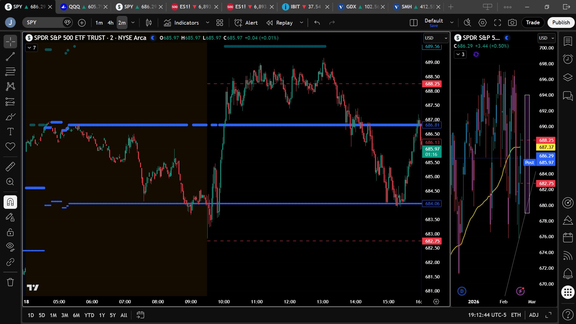 The session validated that roadmap. SPY held above the $684.25 bias early, advanced toward $688.25, and extended slightly beyond to $689.15 before stalling. Pullbacks toward lower targets provided additional long opportunities consistent with the plan.