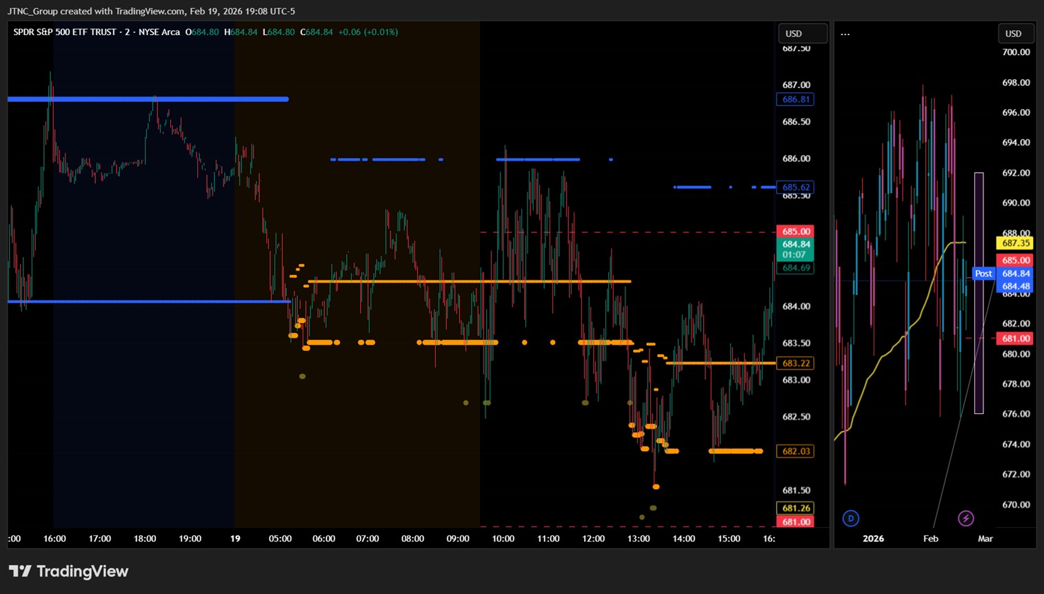 Thursday we stated, "Overnight the bulls want to hold $685 and grind toward $690," and added, "The bears want $685 to fail so they can press price down to $680," while also noting, "Like today, both pushes are likely to fail and keep the market trapped in a wide range." With the MSI opening in a Bearish Trending Market State with extended targets printing below, the short off the open near $683.84 was the textbook setup, targeting the session low around $681.55 where extended targets stopped printing. Once extended targets ceased mid-morning, buying MSI support on a failed breakdown near $682 offered a clean countertrend setup back toward $685. The afternoon brought another opportunity to fade strength near $686 when extended targets stopped printing, working back down to MSI support levels. To the penny these levels played out with precision, and while there were multiple opportunities throughout the session, simply taking the first two clean setups provided clear, straightforward trades that were easy to identify and execute. At minimum it was a two-for-two session for traders following the framework. It was an easy day to read and execute with substantial setups, all identified through proper context, patience, and flexibility while leveraging the MSI, premarket levels, and market structure rather than forcing trades. The MSI continues to prove its reliability as the cornerstone of our trading process.