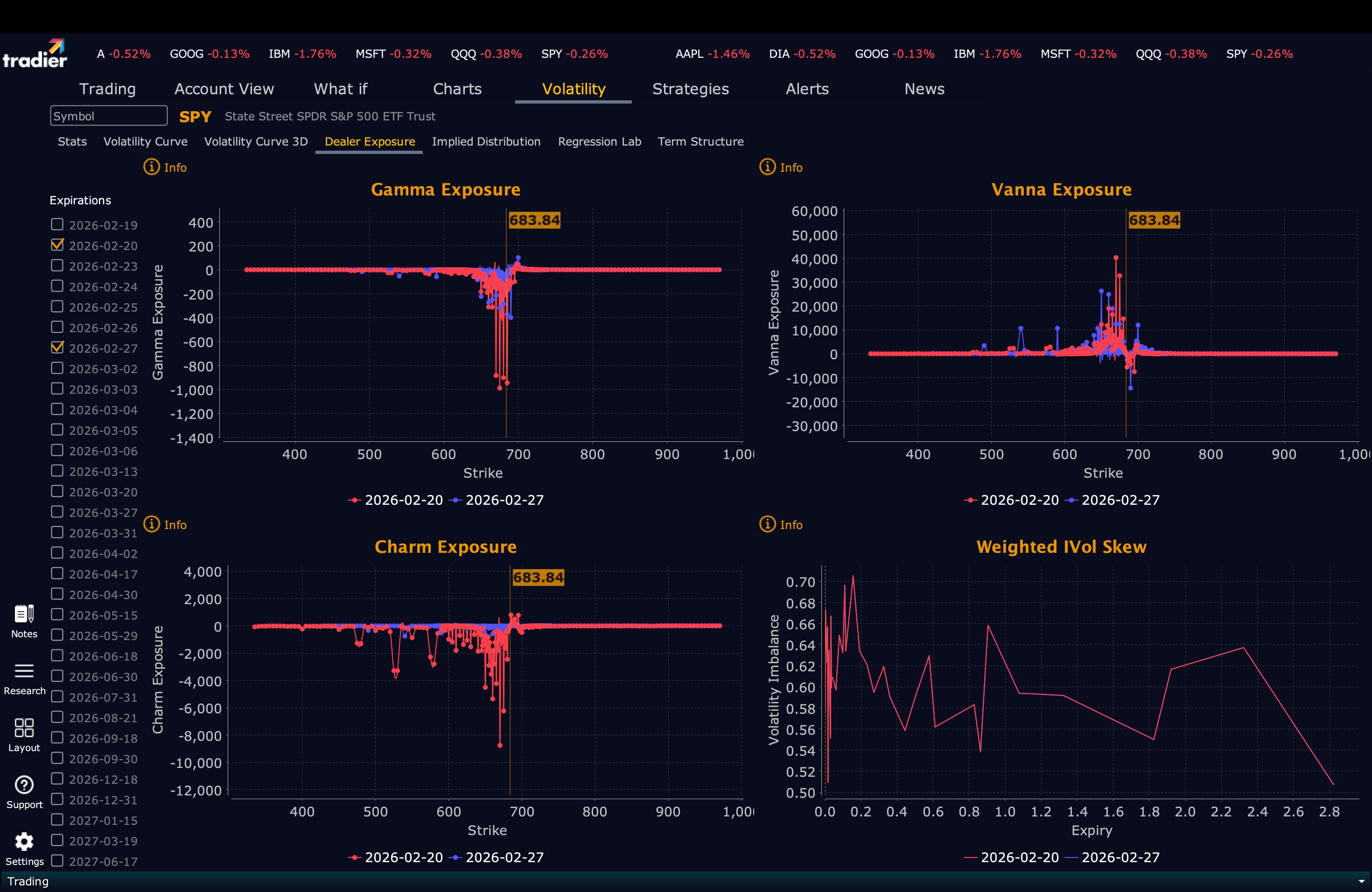 SPY's projected maximum range for Friday is $676 to $692, with the Put side dominating in a steady band that suggests trending price action with intermittent chop. Friday brings Advance GDP q/q, Core PCE Price Index m/m, Flash Manufacturing PMI, and Flash Services PMI, which are likely to produce significant volatility particularly in the first hour of trading. SPY closed at $684.48, down 0.26%, falling back below the $685 level where bears battle the bulls for control in a two-way trading environment. The session saw SPY open at $683.84, reach a high of $686.18 before selling off to a low of $681.55, with trading volume of 58.53M near average while VIX rose 3.11% to 20.23. SPY remains in the $675 to $685 range that has defined much of February, as US stock futures were steady late Thursday with investors bracing for a heavy slate of economic data after the end of a three-day winning streak for the Dow and S&P 500. Our model shows resistance above at $689, $690, $692, and $694, with a break of $689 targeting $690, while support below sits at $682, $680, $676, and $675, where a failure of $682 would target $680, and if $675 breaks there is little to keep price from falling toward the next round number below. The long-term bull trend remains intact above $640, but February continues to prove challenging for longs as we have warned for several weeks, though sharp selloffs remain buying opportunities for a spring and summer rally. As long as price holds above key structural levels, this remains a broader dip-buying environment. Absent a catalyst, resistance sits at $689, $690, $692, $694, while support rests at $682, $680, $676, $675. We favor buying dips at $682 given SPY's position in the lower half of its range. Bitcoin gained 1.16% but closed below $67,197, while MAG stocks had a mostly red day with Apple leading losses at -1.43%, though Meta, Tesla, and Amazon finished green, and sustained weakness across both leadership groups would be required to signal a deeper pullback. VIX rose 3.11% to 20.23, reflecting increased risk-off sentiment as markets face uncertainty ahead of key economic data. SPY closed near the lower end of the bull trend channel from the April lows with structural support near $680.