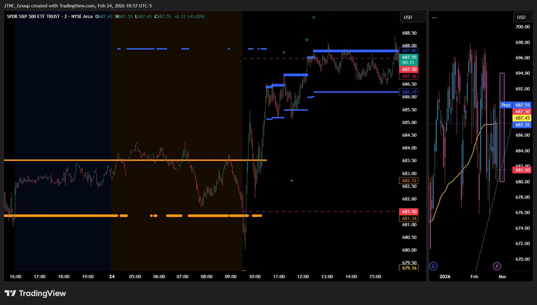 Monday we stated, "Overnight the bulls want to hold $681 and grind toward $686," and added, "The bears want $681.34 to fail so they can press price toward $678," while also noting, "both pushes are likely to fail, keeping the market trapped in a tight range until a catalyst provides direction." With SPY opening at $681.90 and the MSI starting in Bearish Trending Market State, the long off MSI support near $681 was the textbook setup targeting the move back toward MSI resistance. As extended targets printed below mid-morning and around 1 PM, each failed breakdown provided clean buying opportunities with price mean reverting back toward the upper end of the range. Once extended targets stopped printing, the rally accelerated toward MSI resistance around $688, offering a clean short setup back toward the middle of the range. The MSI rescaled higher throughout the session and transitioned from bearish trending to ranging state, supporting the two-way price action that developed. To the penny these levels played out with precision, and while there were multiple opportunities throughout the session, simply taking the first two clean setups provided clear, straightforward trades that were easy to identify and execute. At minimum it was a two-for-two session for traders following the framework. It was an easy day to read and execute with substantial setups, all identified through proper context, patience, and flexibility while leveraging the MSI, premarket levels, and market structure rather than forcing trades. The MSI continues to prove its reliability as the cornerstone of our trading process.