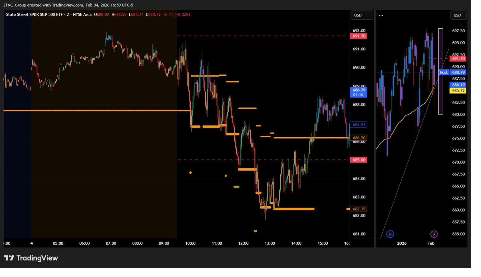 Tuesday’s framework emphasized that as long as SPY held above $685, bulls would retain control despite elevated volatility and headline-driven risk. We warned that February is historically prone to surprise selloffs and that sharp intraday moves were likely to be met with aggressive dip buying.