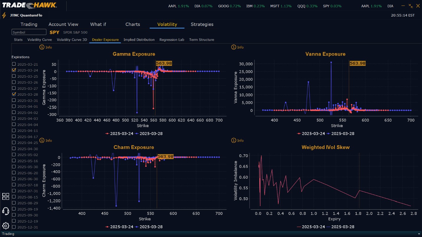 Dealers are selling $564 to $590 and higher strike Calls while buying $582 Calls indicating the Dealers desire to participate in any rally next week should price break $582. This positioning does not display confidence by the Dealers that prices will rise next week. But given today was quad witching, this positioning is likely to change on Monday. To the downside, Dealers are buying $563 to $525 and lower strike Puts in massive quantities in a 4:1 ratio to the Calls they are selling/buying, reflecting a bearish view for next week. Dealer positioning remains unchanged from today staying bearish from bearish. Dealers are perhaps preparing for the April 2nd tariffs anticipating the market may become more challenging the closer we get the implementation of these tariffs. Dealers are heavily protected from a flash much lower, even buying $475 and lower strike Puts in size. Our recommendation is to follow the Dealers’ lead, ensuring any long book has protection heading into April. While our model sees prices in April moving higher, our model also sees a 20% correction on the horizon near the end of Q2 as the results of the administration’s economic policies begin to be felt by businesses across the globe. We advise reviewing Dealer positioning daily for clues to the market’s direction given Dealer positioning changes and it’s essential to monitor these updates for shifts in sentiment.