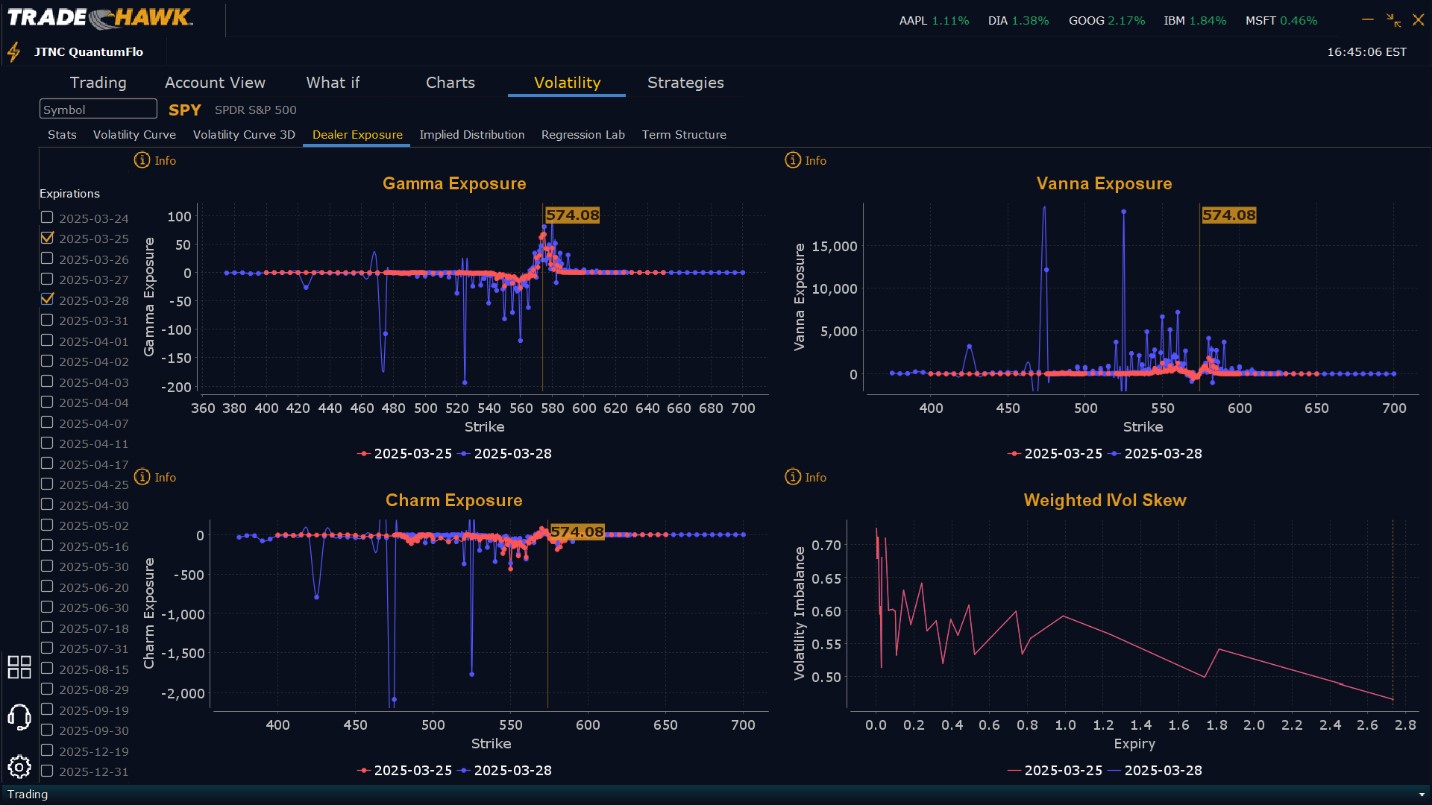 Dealers are selling $575 to $590 and higher strike Calls while buying $582 Calls indicating the Dealers desire to participate in any rally next week should price break $582. This positioning does not display a lot of confidence by the Dealers that prices will rise beyond $582 this week. To the downside, Dealers are buying $573 to $525 and lower strike Puts in a 5:1 ratio to the Calls they are selling/buying, reflecting an increasingly bearish view for the week. Dealer positioning has changed from bearish to more bearish. Dealers are perhaps preparing for the April 2nd tariffs anticipating the market may become more challenging the closer we get the implementation of these tariffs. Dealers are heavily protected from any quick move lower, buying $475 and lower strike Puts in size. Our recommendation is to follow the Dealers’ lead, ensuring a long book has protection heading into April. While our model sees prices in April moving higher, our model also sees a 20% correction on the horizon near the end of Q2 as the results of the administration’s economic policies begin to be felt by businesses across the globe. We advise reviewing Dealer positioning daily for clues to the market’s direction given Dealer positioning changes and it’s essential to monitor these updates for shifts in sentiment.
