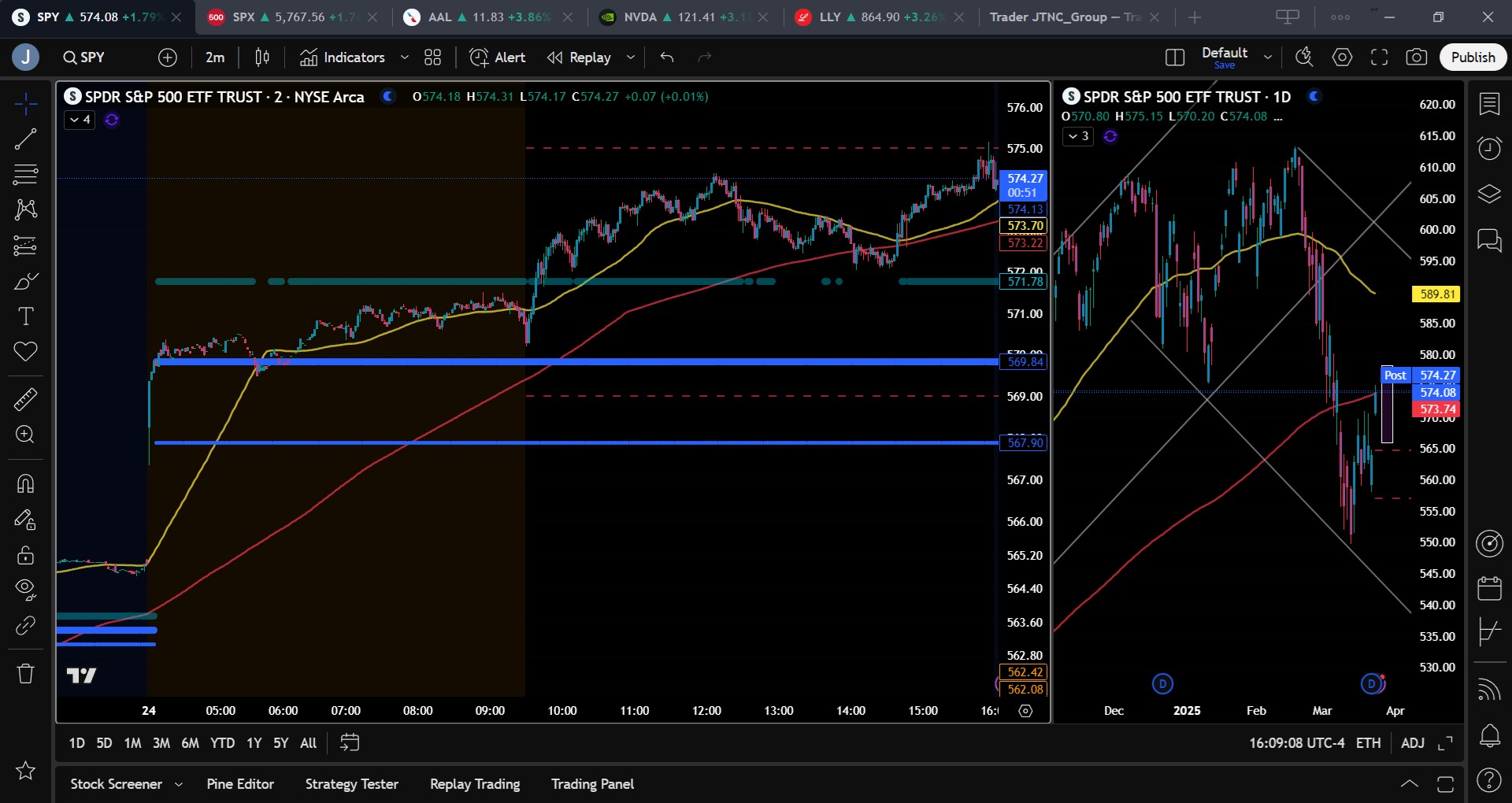 Our model projects a maximum trading range between $566 and $578.25 for Tuesday, slightly wider than previous sessions and indicative of choppy price action with periods of potential trending action. The session is Call-dominated, reflecting a slightly bullish tilt. SPY broke out of the recent narrow range and closed above the 200 DMA, signaling potential follow-through to the upside. Resistance is stacked at $575, $580, and $582, with support at $573, $570, and $565. A break above $582 opens the path toward $585, while failure to hold $570 risks a slide to $565 or lower. There’s little support below $565 to prevent a move to $560 or lower, and little resistance above $582 to stop price from advancing toward $590. Today’s close above the 200-day moving average—the first in two weeks—is significant. The tight range that previously capped price has broken, and while a heavy wall of resistance remains between $575 and $580, the higher price pushes into that zone, the more likely it is that bulls reclaim the critical $585 level—the clear line dividing bull control from bear control. Our current lean: the bears lost a meaningful amount of control today. Their case weakens substantially unless $570 fails. If $570 holds, price likely pushes toward $580, potentially pauses, dips, and then advances to the $585 "DMZ" zone. A break below $570 puts the 200 DMA back in play and opens the door for a retest of $565, which becomes the final stand for the bulls. If $565 gives way, expect downside momentum to accelerate. On the macro side, PMI data came in mixed—strength in services offset by weakness in manufacturing. This leans dovish and supports the lower-rate narrative. However, with the April 2nd tariff deadline looming, a negative market reaction remains possible this week. If we get through that event without new lows, we expect a bullish grind higher into the end of Q2. SPY remains mid-range within a broad bear trend channel drawn from the December highs, leaving room for movement in either direction. This channel is likely to continue containing price for several weeks. With the channel from December highs still intact, SPY remains mid-range, with room to run either direction depending on news flow.