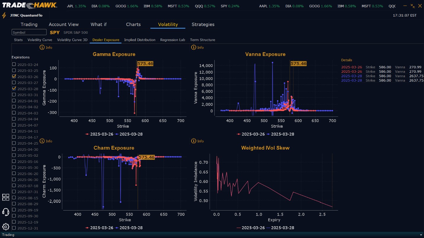 Dealers are selling $576 to $590 and higher strike Calls indicating the Dealers do not have a lot of confidence prices will rise beyond $580 by Friday. To the downside, Dealers are buying $575 to $525 and lower strike Puts in a 3:1 ratio to the Calls they are selling, reflecting a slightly bearish view for the week. Dealer positioning has changed from bearish to slightly bearish. Dealers are still prepared for April 2nd tariffs but seem to be showing a bit less concern as we head into Friday. Our model sees prices in April moving higher but also sees a 20% correction on the horizon near the end of Q2 as the results of the administration’s economic policies begin to be felt by businesses across the globe. We advise reviewing Dealer positioning daily for clues to the market’s direction given Dealer positioning changes and it’s essential to monitor these updates for shifts in sentiment.