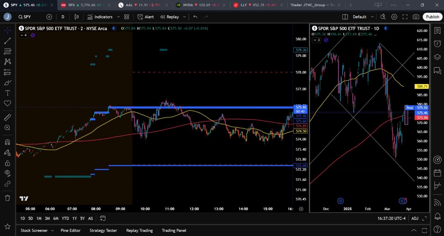 The market was stuck today in a very narrow range after breaking out of the prior $560 to $570 range. The market is in consolidation mode and is filling in a new, narrow range between $572 and $578. As volume is absorbed, price will breakout of this tight range. Unless an external catalyst derails the current three day rally, the breakout will be higher to $585. We anticipate chop on Wednesday therefore advise remaining flexible—should an unexpected catalyst hit, trade what’s in front of you. We still favor two-way trading, but we’re no longer aggressively selling every rally. Like yesterday, instead, we're leaning toward buying dips, especially as price moves toward the $585 level. A clean break above $585 would give the bulls full control. Until then, the bulls maintain a slight edge—perhaps 60/40—not a dominant mandate by any means. Price may continue to chop around the 200-day moving average as it builds energy for a decisive move—either above $585 or below $565. Should we lose $565, a move to $550 becomes likely. In this kind of environment, we recommend focusing on failed breakout or breakdown setups at major levels. These offer the best risk/reward—especially when confirmed by non-extended readings on the MSI. Counter-trend trades should only be considered when price is testing a key level and conditions align. Stay nimble and disciplined. We're still in a market where the bears are in control, but that could shift quickly. Focus on trading from the edges, where risk is defined and odds improve. As always, review our premarket analysis before 9:00 AM ET for the latest levels and signals.