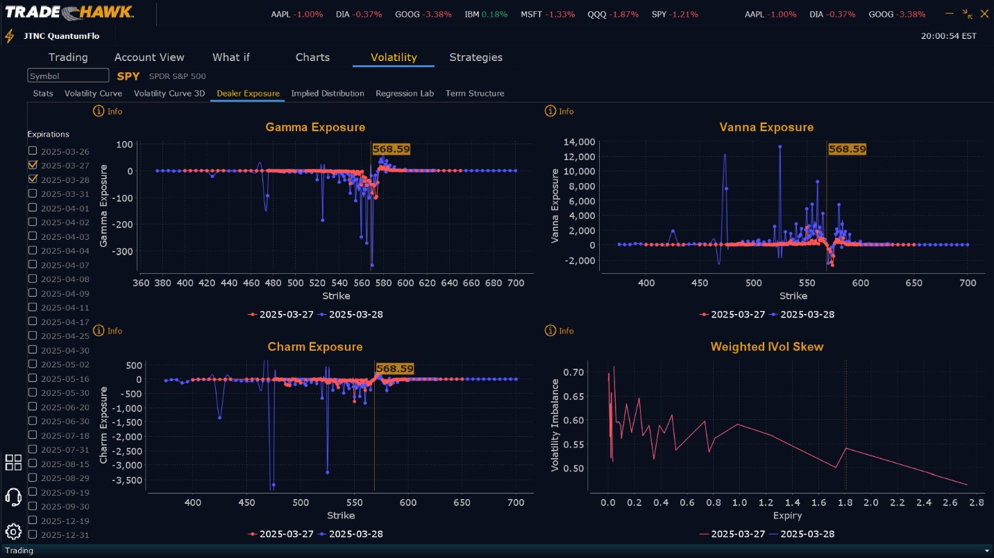 Dealers are selling $576 to $590 and higher strike Calls while buying $569 to $575 Calls indicating the Dealers desire to participate in any relief rally into Friday to as high as $580. It certainly appears that Dealer have a ceiling at this level for this week. To the downside, Dealers are buying $568 to $525 and lower strike Puts in a 2:1 ratio to the Calls they are selling/buying, reflecting a neutral view for the rest of the week. Dealer positioning has changed from slightly bearish to neutral. Dealers are prepared for tariffs but seem to be showing us that price may find a support in the current range this week. Our model sees prices in April moving higher but also sees a 20% correction on the horizon near the end of Q2 as the results of the administration’s economic policies begin to be felt by businesses across the globe. We advise reviewing Dealer positioning daily for clues to the market’s direction given Dealer positioning changes and it’s essential to monitor these updates for shifts in sentiment.