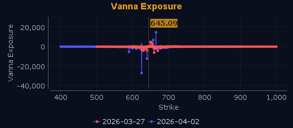 Dealers are selling SPY $652 to $661 and higher strike Calls while buying $647 to $650 Calls, indicating the Dealers' desire to participate in any rally next week. The ceiling for the week appears to be $652. To the downside, Dealers are buying $644 to $620 and lower strike Puts in a 5:1 ratio to the Calls they're selling/buying displaying heightened concern that prices could move lower. Dealers remain concerned about lower prices heading into next Friday with bearish positioning however notably calmer, suggesting consolidation is the more likely outcome with $645 acting as a gravitational floor and $652 capping any relief rally. For the week Dealer positioning is unchanged at bearish.