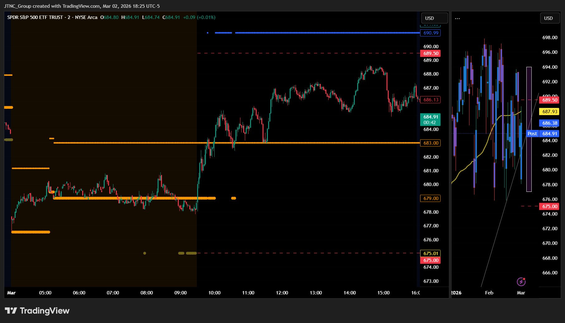 Trading opportunities materialized exactly where we anticipated, with the early morning dip to $678.03 offering an ideal entry point for those following our guidance. The subsequent rally of over $10 per share to the $688.62 peak represented substantial profit potential for traders who positioned accordingly. The market's behavior around these key levels reinforced the reliability of our technical framework, with SPY closing strong at $686.38 and posting a modest gain of 0.06%. The elevated volume of 83.70 million shares, running higher than average, confirmed the institutional participation we expected during this technical setup. Today's validation underscores the consistent value our premarket analysis provides for navigating intraday market dynamics.
