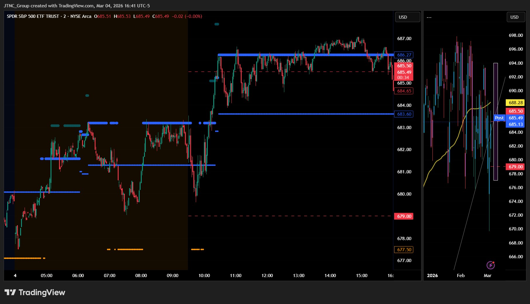 Wednesday we stated, "Bulls want to hold current levels overnight and push toward $685," and added, "bears want to see $680.09 fail to press price toward $675," while also noting, "both pushes are likely to fail initially, keeping the market trapped in the current range until a catalyst provides direction." The session delivered exactly what the MSI framework anticipated with the market opening lower near $681.63 and immediately testing downside pressure before finding support. With the MSI opening in Bullish Trending State and extended targets printing above in the premarket and for much of the day, the longs were favored all day from MSI support levels to $685. Once extended targets stopped printing, there were opportunities to short the market into the close but given the prominence of extended targets all day, going long at $681 and holding for $685 was the easy trade and easy to see. To the penny these levels played out with precision, and while there were multiple opportunities throughout the session, simply taking the first long setup provided a clear, straightforward trade that was easy to identify and execute. At minimum it was one and done for traders following the framework with an easy day to read and execute with substantial setups, all identified through proper context, patience, and flexibility while leveraging the MSI, premarket levels, and market structure rather than forcing trades. The MSI continues to prove its reliability as the cornerstone of our trading process.