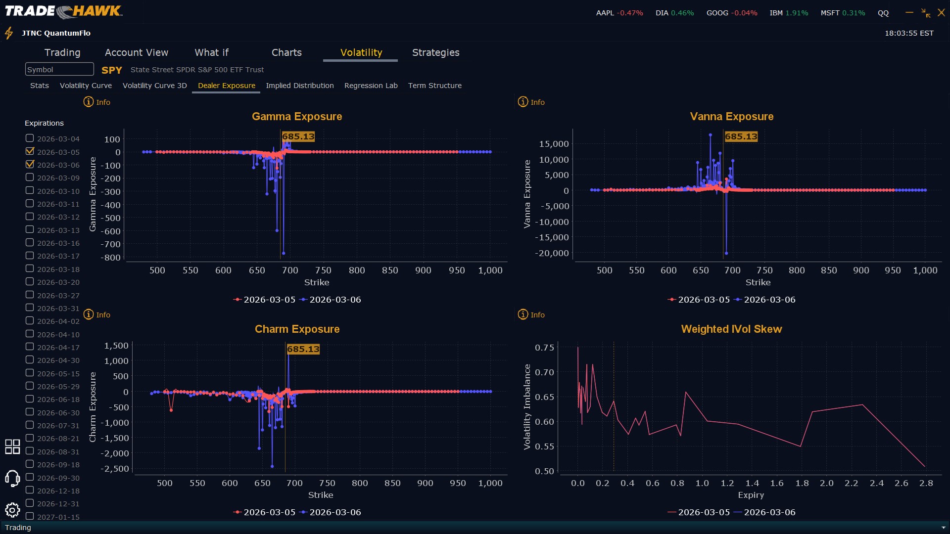 Dealers are selling SPY $691 to $715 and higher strike Calls while buying $686 to $690 Calls, indicating the Dealers' desire to participate in any rally this week. The ceiling for the week appears to be $700. To the downside, Dealers are buying $685 to $560 and lower strike Puts in a 6:1 ratio to the Calls they're selling/buying displaying heightened concern that prices could move lower. For the week Dealer positioning is unchanged from bearish. We advise reviewing Dealer positioning daily for directional clues. These positions evolve quickly and tracking them is essential for staying ahead of shifting market sentiment.