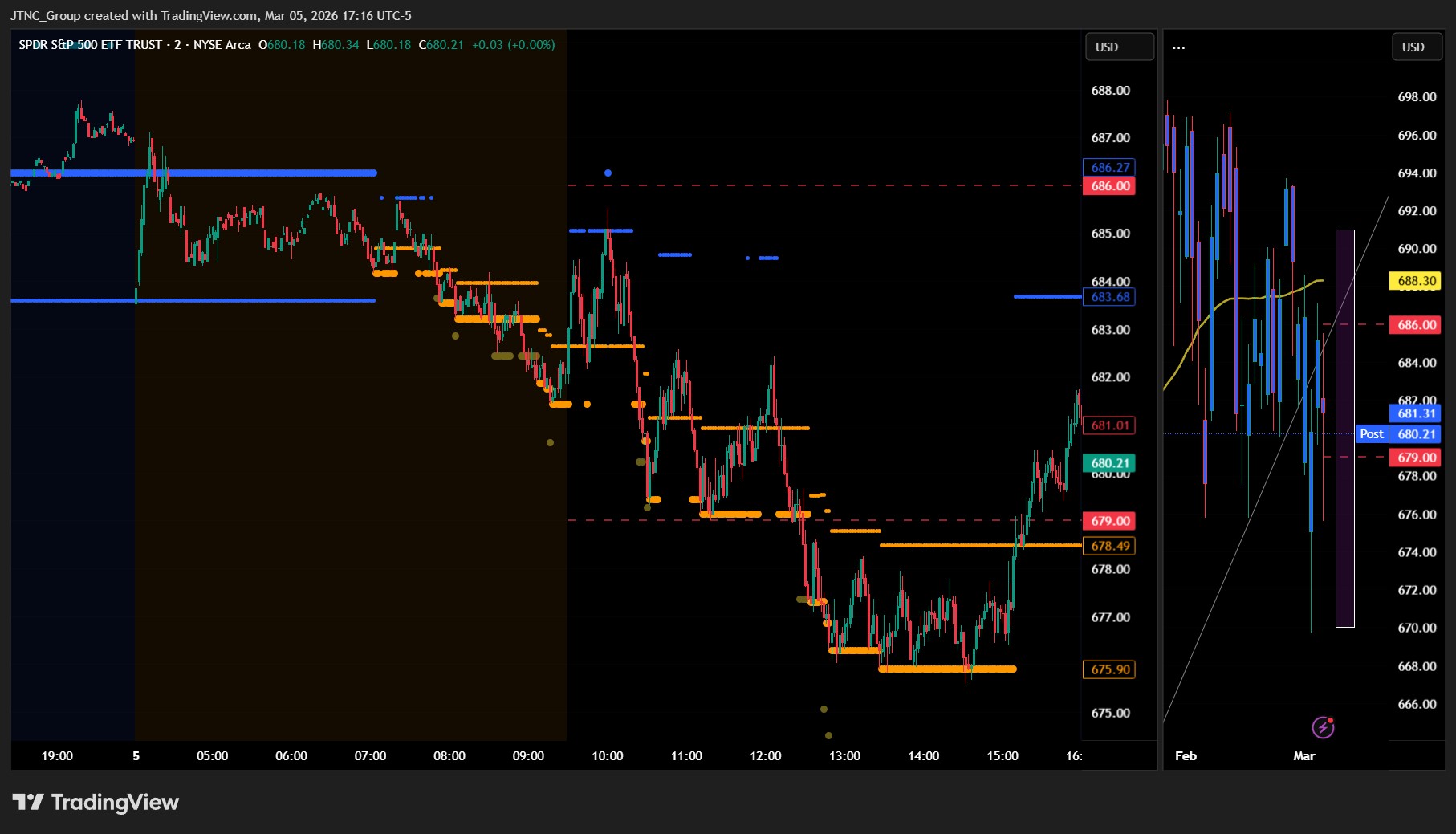 The MSI ended Thursday in a Ranging Market State with SPY closing at $680.21, positioned in the middle of the range between MSI resistance and support. Extended targets were not printing at the close, which is typical for a Ranging state. Extended targets did print during the regular session, below the MSI as well as during the premarket. The MSI rescaled lower multiple times throughout the session, stepping down from higher levels in early morning. The session started with Bearish Trending state in premarket, then transitioned through multiple rescales during the morning session before ending in Ranging state by close. The MSI forecast for Friday calls for choppy, two-way price action, likely testing both ends of the day's range without establishing a sustained trend. MSI resistance is $684 with support at $678.49.