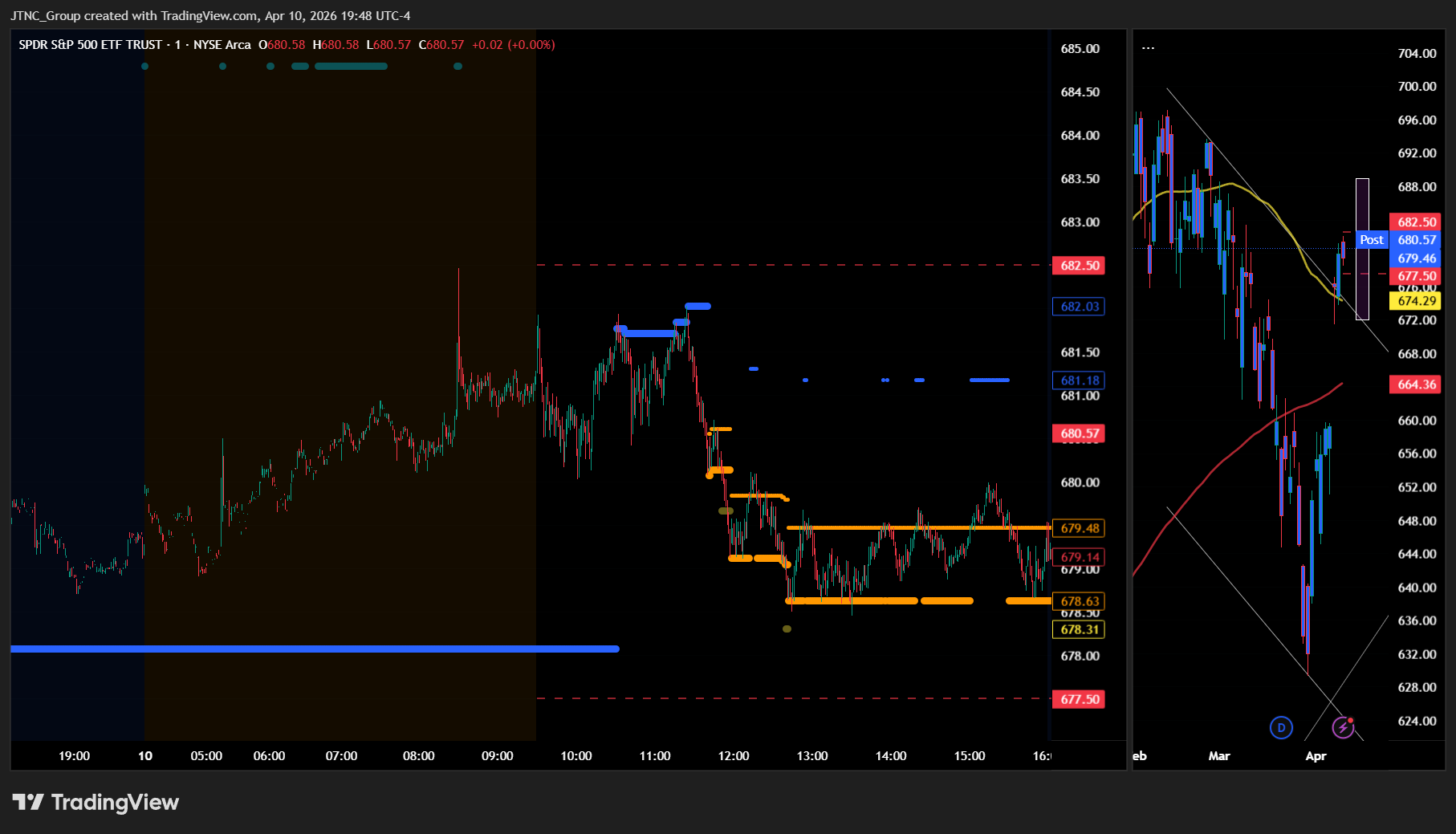 This morning's premarket analysis positioned SPY at $680.43 with the critical bias level established at $679.50. The framework outlined upside targets at $682.50 and $685 for scenarios where the market could sustain its recovery gains, though the analysis emphasized growing participant desire to unwind the upward journey and consolidate gains. The assessment noted the market was hanging onto recovery gains "very, very tenuously" with constant questioning of whether current levels represented a peak. Downside support was mapped at $677.50, $675, $674, and $668 for consolidation scenarios if the bias level failed to hold. The analysis warned of a potential cascade effect if participants began taking profits, with particular concern about losing $674 which could trigger moves toward $668.