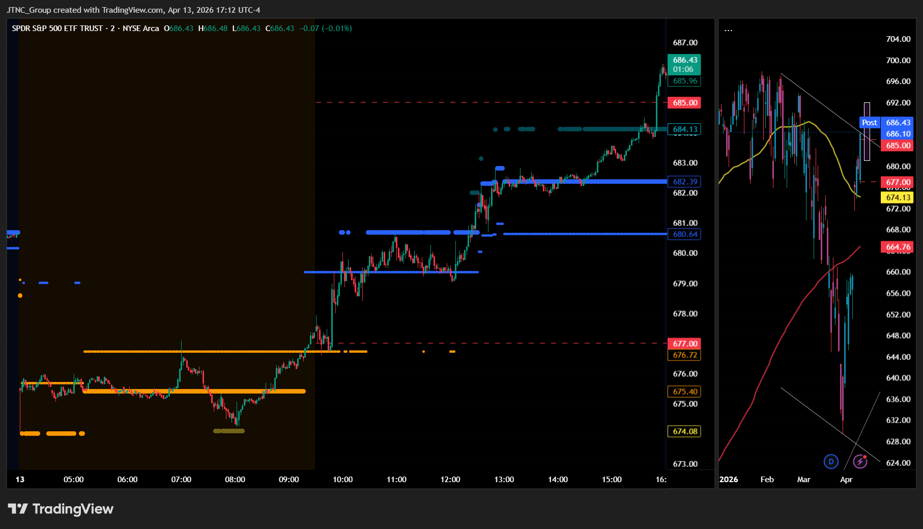 Friday we stated, "Bulls want to hold current levels overnight and push toward $682," and added, "Given the narrow $0.85 MSI spread and Friday's transition into a tight bearish range, Monday is expected to see sideways to possibly up action," while also noting, "With SPY having closed above MSI resistance at $679.48, this level now becomes key support that bulls need to defend decisively to maintain the current structure." Monday's session exceeded bullish expectations as the market opened at $677.41 and faced early pressure that pushed price toward $674, but the bulls stepped in decisively and launched a sustained rally throughout the entire session. The MSI rescaled higher several times as bulls regained control and pushed the indicator into a bullish trending framework that persisted from open through close. Extended targets were visible above throughout the entire session from premarket through the close, providing consistent bullish signals that aligned perfectly with the price action. The primary setup was buying any dip toward the evolving MSI support levels as the bullish trending state provided clear directional bias for the entire session. Bulls maintained control after the initial morning weakness, with SPY hitting a session high of $686.29 before closing near highs at $686.13. At minimum it was a three-for-three session for traders following the framework as the MSI provided clear bullish signals with the moderate spread offering substantial profit potential within the established structure. It was an easy day to read and execute with substantial setups, all identified through proper context, patience, and flexibility while leveraging the MSI, premarket levels, and market structure rather than forcing trades. The MSI continues to prove its reliability as the cornerstone of our trading process.