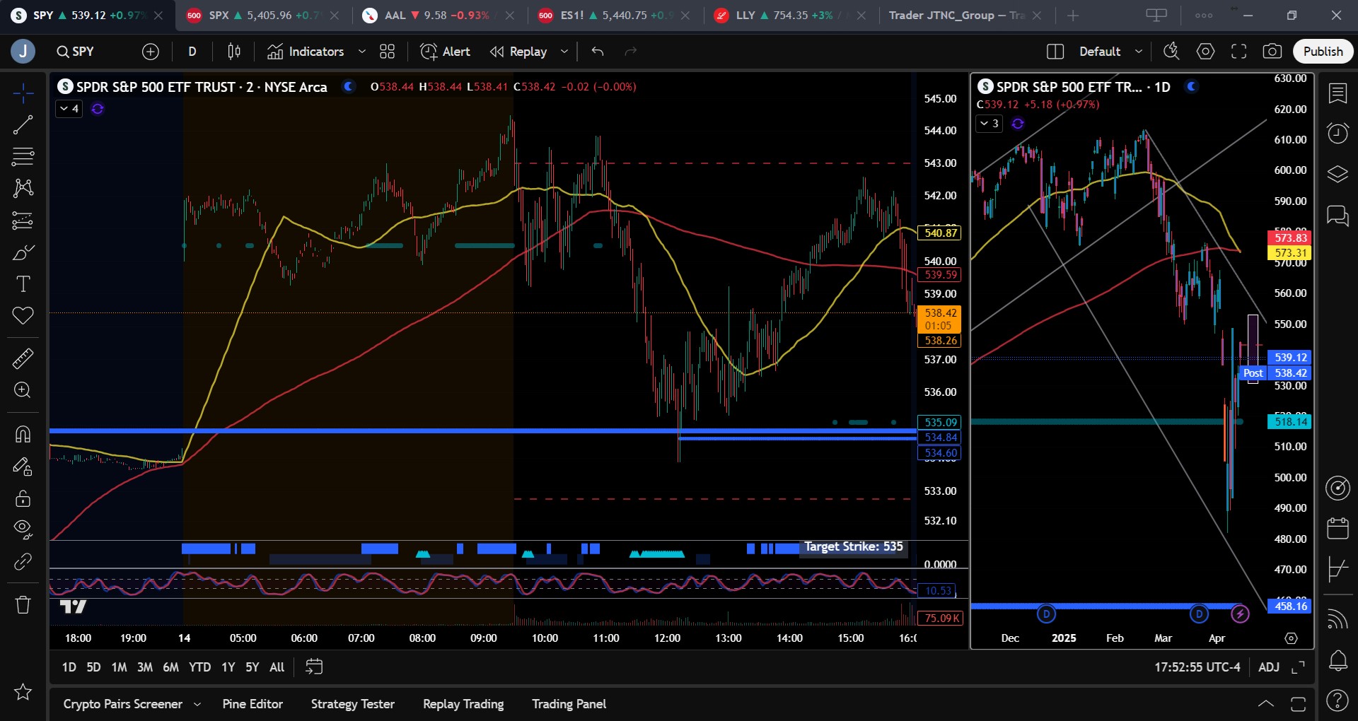 Friday’s forecast outlined a projected range for SPY of $515 to $550, with a bullish lean if $535 could be reclaimed and held. Resistance was seen at $535 and $540, while support was marked at $527 and $520. The model favored long setups above $535 with upside targets toward $540 and $543. Short opportunities were expected on failed breakouts or any breach of $527, with a move back to $520 as a likely outcome. The strategy also emphasized the importance of trading with momentum and being responsive to price action around key levels, particularly in an environment driven by external headlines.