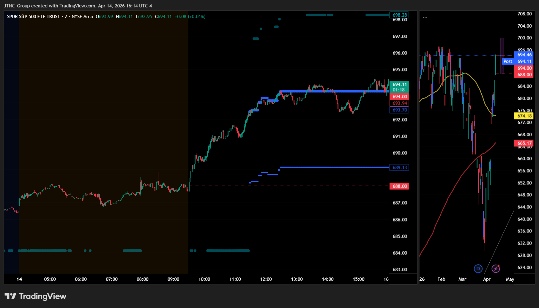 SPY's projected maximum range for Wednesday is $688 to $700, with the Call side dominating in an expanding band that suggests trending price action with intermittent chop. Wednesday brings no economic news due out so the market will trade on technicals. SPY closed at $694.22, up 1.18%, after opening at $687.69 and rallying throughout the session to a high of $694.58 before settling near the highs, while the VIX dropped 3.50% to 18.45 suggesting a significant reduction in fear as risk-on sentiment returned to the market. SPY remains in the $690 to $695 range that has defined recent trading, with the US blockade of the Strait of Hormuz and ongoing Iran conflict keeping energy markets volatile even as peace talk optimism grows. If SPY breaks above the first resistance at $695, it targets $700, while a break below the first support at $690 would target $688, and if the lowest support at $683 breaks there is little to keep price from falling toward $680. The long-term bull trend remains intact above $640 with SPY well above structural support, and as long as price holds above key structural levels, this remains a broader dip-buying environment. Absent a catalyst, resistance sits at $695, $700, $702, $705, while support rests at $690, $688, $685, $683. We favor shorting rallies near $695 given SPY's position at the top of its recent range. Bitcoin showed slight weakness with a -0.12% decline to close above $74,393, while MAG stocks had a mostly green day across the board led by Meta up 4.41% with the exception of Apple down -0.16%, and this mixed action in leadership groups suggests the market is still finding its footing after recent volatility. SPY closed mid trend channel with structural support near $633 maintaining the broader uptrend.