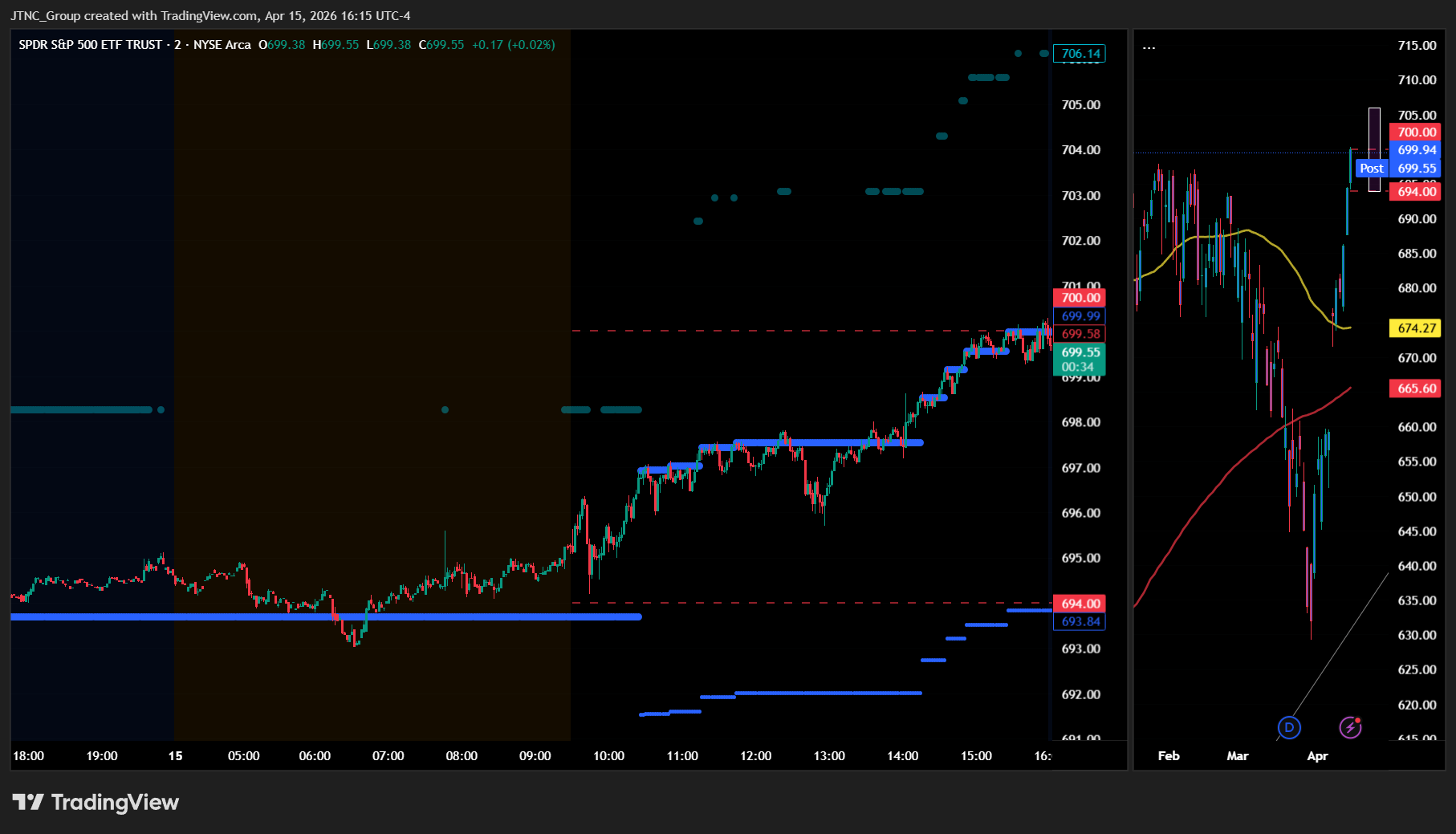 SPY's projected maximum range for Thursday is $694 to $706, with the Call side dominating in an expanding band that suggests trending price action with intermittent chop. Thursday brings no economic news due out so the market will trade on technicals. SPY opened at $695.26 and traded as high as $700.28 before finding a low at $694.28, ultimately closing at $699.89, up 0.78%, while the VIX dropped 1.42% to 18.10, suggesting a reduction in fear as markets digested the recent advance. SPY remains in the $695 to $700 range that has defined recent trading, with ongoing geopolitical tensions in Eastern Europe providing a backdrop of uncertainty. Looking ahead, if SPY breaks above the first resistance at $700, it targets the next level at $705, while a break below initial support at $695 would target $694 to the downside. The long-term bull trend remains intact above $640 with SPY well above structural support, and as long as price holds above key structural levels, this remains a broader dip-buying environment. Absent a catalyst, resistance sits at $700, $705, $706, $707, while support rests at $695, $694, $690, $685. We favor buying dips at $695 given SPY's close near the upper end of its recent range. Bitcoin closed above $74,885, up 0.95%, while MAG stocks showed mostly green action led by Tesla up 7.62% with the exception of Amazon down 0.21%, and this broad strength across leadership groups supports the broader rally. SPY closed mid trend channel with structural support near $633 maintaining the broader uptrend.