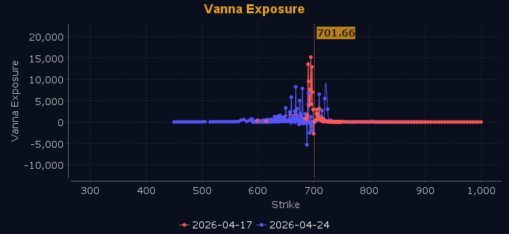 Dealers are selling SPY $702 to $735 and higher strike Calls, indicating the Dealers' belief that higher prices may be in store. The ceiling for next week appears to be $710. To the downside, Dealers are selling $697 to $688 Puts while buying $695 to $590 and lower strike Puts in a 3:1 ratio to the Calls they're selling displaying their belief that any pullback is likely limited to $688. Dealers do not sell ATM Puts unless they believe there is a floor in the market at $688. This shift shows dealers are selling near the money Puts but are no longer buying Calls which implies a market which may drift higher or potentially pullback, with dealers believing the market needs time to digest the move off the March 30th low and anticipating a week of sideways price movement. For the week Dealer positioning is unchanged at neutral/slightly bearish. We advise reviewing Dealer positioning daily for directional clues. These positions evolve quickly and tracking them is essential for staying ahead of shifting market sentiment.