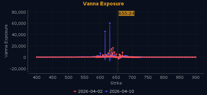 Dealers are selling SPY $658 to $680 and higher strike Calls while buying $656 to $657 Calls, indicating the Dealers' desire to participate in any rally on Thursday. The ceiling for Thursday appears to be $670. To the downside, Dealers are buying $655 to $590 and lower strike Puts in a 3:1 ratio to the Calls they're selling/buying displaying heightened concern that prices could move lower. With the pullback from major resistance at $660, dealers appear to be positioning for a period of consolidation as we head into the long weekend. Dealer positioning is unchanged at neutral/slightly bearish.