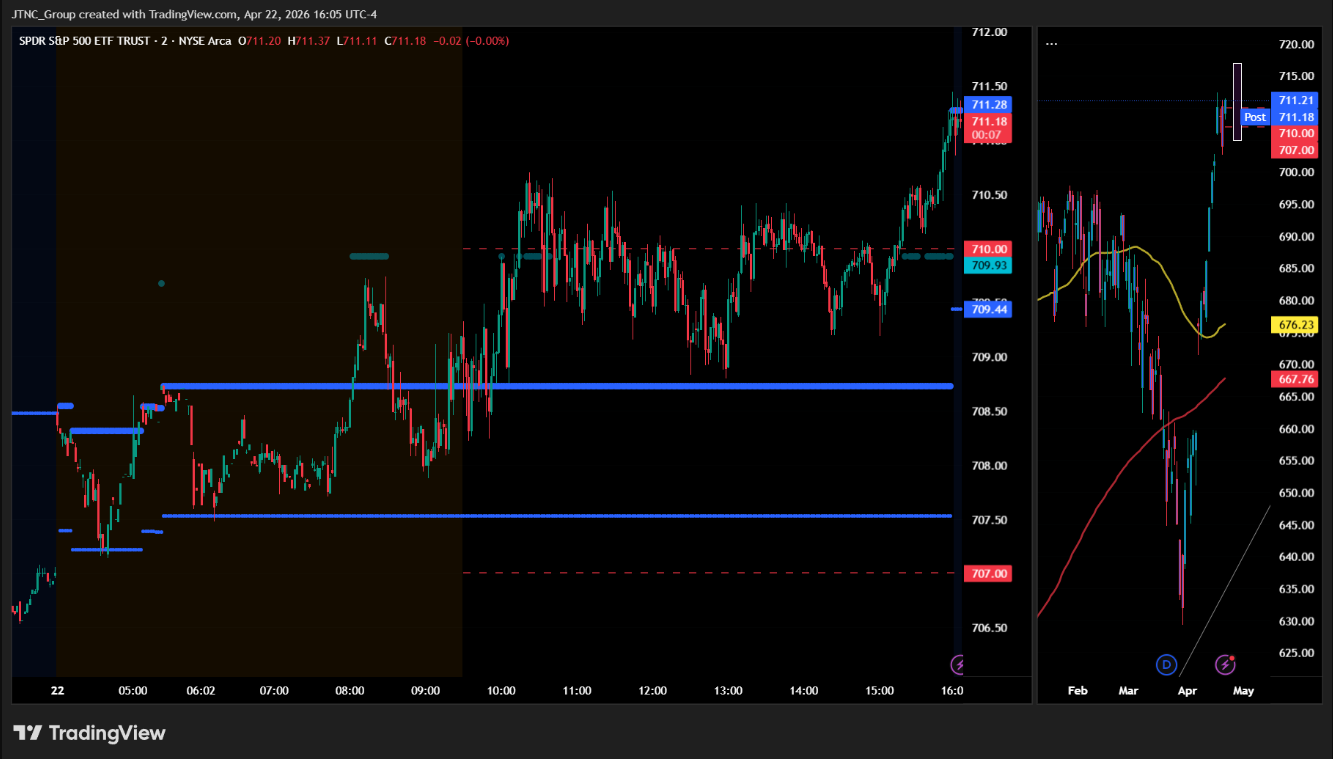 Tuesday we stated, "Bulls want to see overnight strength hold current levels and push toward $705.45," and added, "bears want to see $703.93 fail to press price toward lower support levels," while also noting, "the narrow spread indicates the MSI could easily rescale overnight, so traders should be prepared for a shift in market state." The bulls got exactly what they wanted as overnight buying interest emerged and the MSI rescaled from bearish to bullish, setting up a powerful continuation higher. The session began with the MSI already in a bullish state with extended targets above, and SPY opened at $709.15 and immediately found support at the MSI framework levels. The narrow bullish range provided clear buy signals at support targeting the resistance level above, and as the MSI rescaled higher later in the session, each new level offered additional long opportunities. Bulls had multiple chances to buy dips to MSI support throughout the session, with each test of support providing an entry targeting the resistance above. The framework delivered clean setups as price respected the MSI levels and pushed toward new highs, reaching $711.45 before closing at $711.18. At minimum it was a 1-for-1 session for traders following the framework. It was an easy day to read and execute with substantial setups, all identified through proper context, patience, and flexibility while leveraging the MSI, premarket levels, and market structure rather than forcing trades. The MSI continues to prove its reliability as the cornerstone of our trading process.