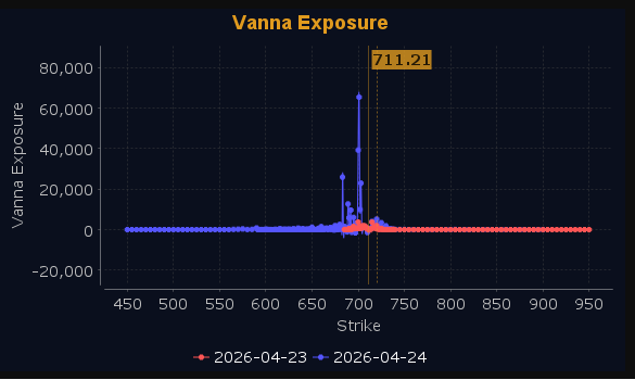 Dealers are selling SPY $714 to $737 and higher strike Calls while buying $712 to $713 Calls, indicating the Dealers' desire to participate in any rally on Thursday. The ceiling for Thursday appears to be $715. To the downside, Dealers are buying $710 to $650 and lower strike Puts in a 2:1 ratio to the Calls they're selling displaying moderate concern that prices could move lower. Dealer positioning is unchanged at neutral/slightly bullish.