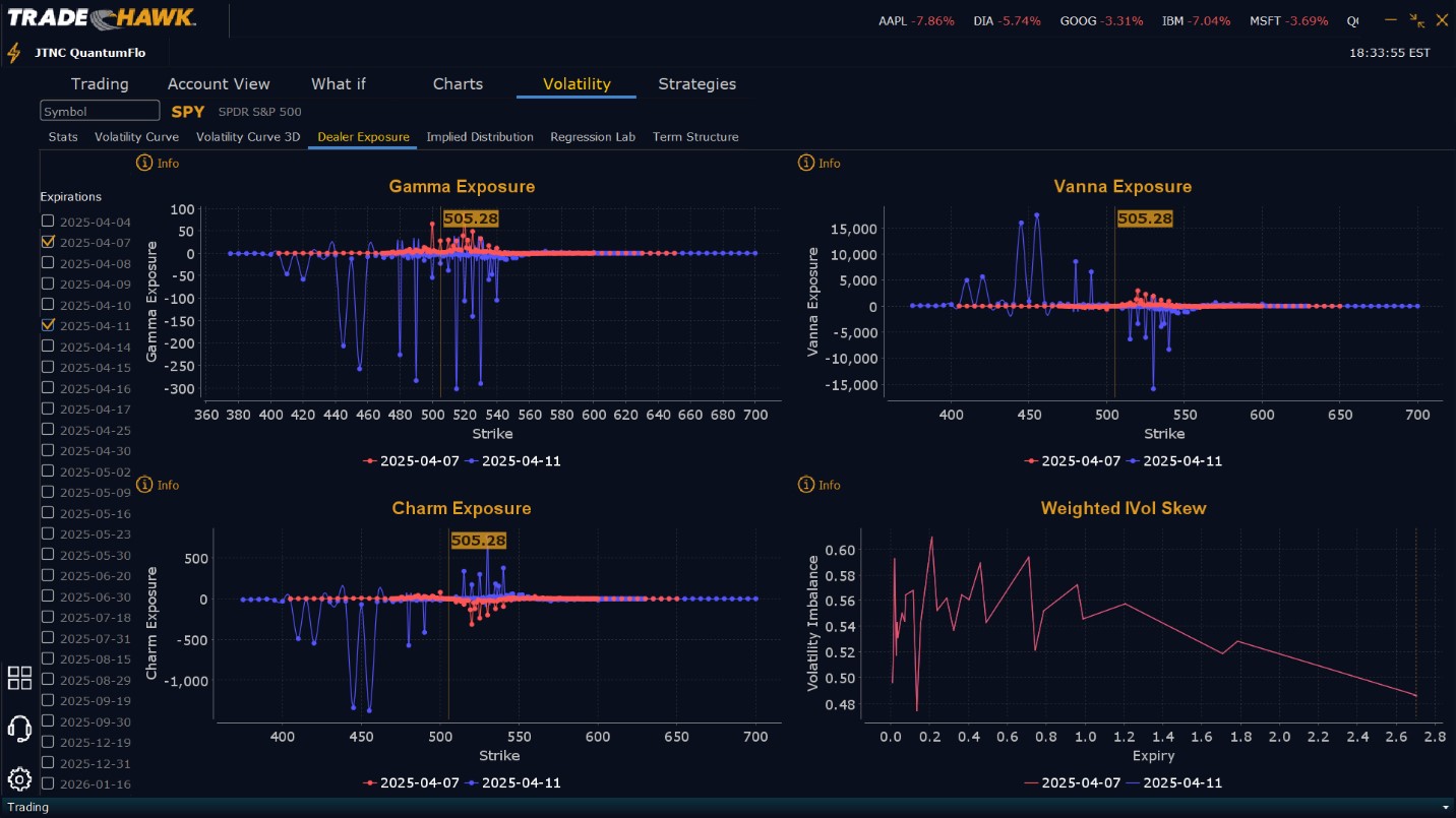 Dealers are actively selling Calls from $543 to $570 and beyond, while buying $506 to $542 Calls signaling their desire to participate in any relief rally next week. Dealers have bought large quantities of Calls which reinforce this belief. Perhaps Dealers believe tariffs will be negotiated and price will rally later next week. To the downside, Dealers are buying Puts from $505 to $445 and lower in a 1:1 ratio to the Calls they’re buying/selling. This reflects a neutral to slightly bullish outlook for next week. Dealer positioning has shifted from bullish to slightly bullish/neutral. Dealers have increased their protection levels we haven’t seen in a long time. Their positioning certainly shows an openness to the possibility that price could rally next week. We've emphasized all week that our model is pointing to worsening financial conditions and that investors should purchase downside protection. Once again that advice was salient today. At some point the market will put in a two or three day relief rally, which will give all those who did not head this warning to secure downside protection. We advise reviewing Dealer positioning daily for directional clues. These positions evolve quickly, and tracking them is essential for staying ahead of shifting market sentiment.