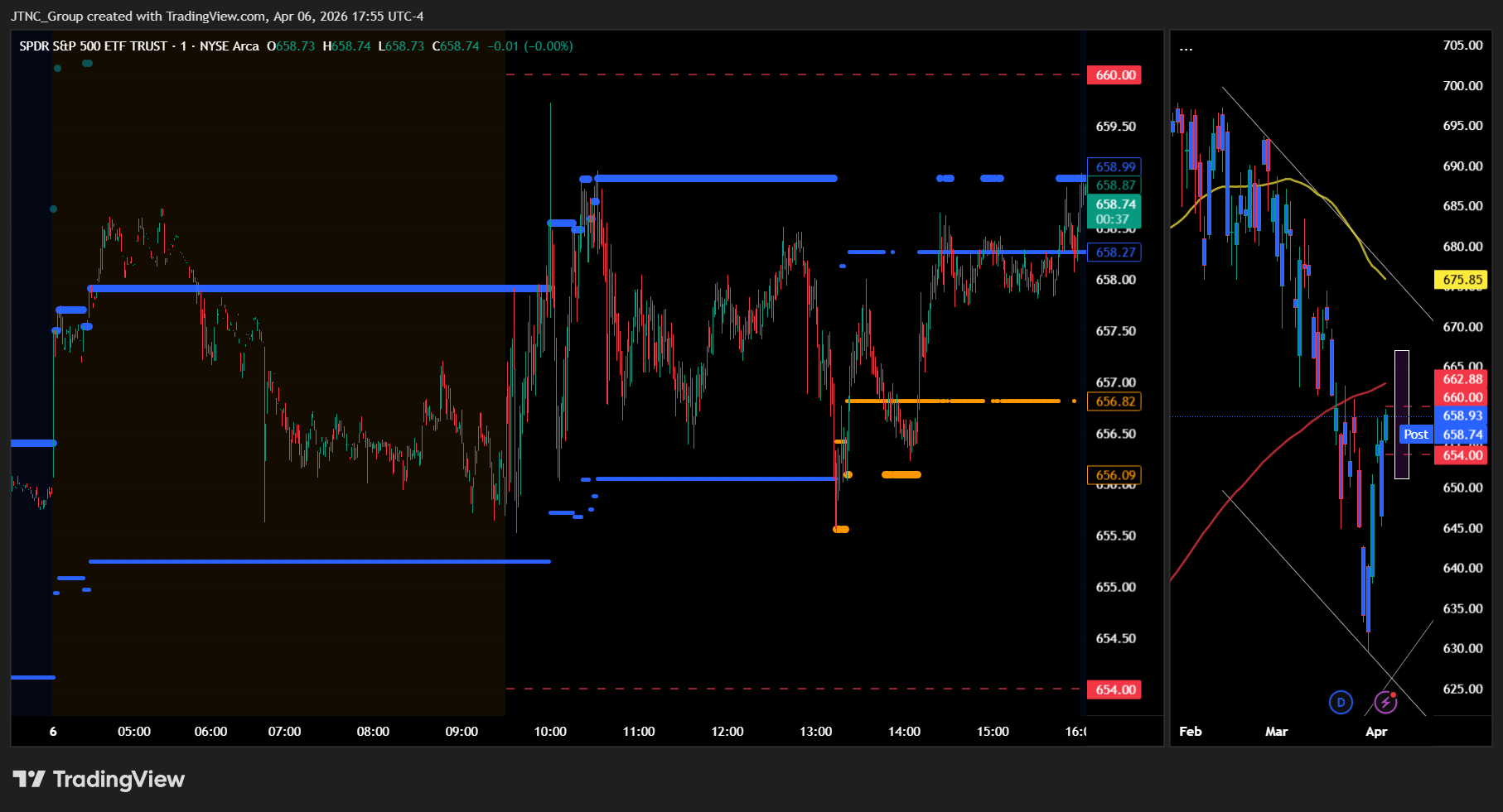 Friday we stated, "Bulls want to hold current levels overnight and push toward $658," and added, "bears want to see the $653.84 support fail to press price toward lower levels around $650," while also noting, "Given the narrow $2.20 MSI spread and Friday's consolidation within the bullish framework, Monday is expected to continue the bullish momentum though the move may be modest given the absence of extended targets at the close." Monday's session validated this framework as the market pushed through the target $658 level and reached an intraday high of $659.72. The MSI rescaled higher multiple times throughout the session, confirming the underlying bullish strength despite periods of consolidation. Extended targets were visible above in premarket and during the AM session, providing additional confirmation of bullish intention. The primary setup was buying any dip toward MSI support and targeting resistance, with the rescaling action providing multiple opportunities for intraday moves within the trending structure. The bulls maintained control decisively as the rapid rescaling higher validated the bullish momentum. SPY managed a solid 0.47% gain, grinding from the $655.86 open to reach $659.72 before settling at $658.94 just below the final MSI resistance level. At minimum it was a two-for-two session for traders following the framework as the MSI provided clear signals with multiple opportunities to buy dips and sell rallies within the trending structure despite the intraday rescaling activity. It was an easy day to read and execute with substantial setups, all identified through proper context, patience, and flexibility while leveraging the MSI, premarket levels, and market structure rather than forcing trades. The MSI continues to prove its reliability as the cornerstone of our trading process.