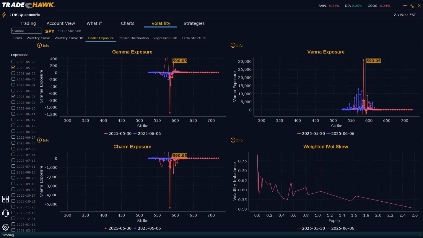 Dealers are selling SPY $591 to $605 and higher strike Calls implying the likelihood that prices will not move beyond $595 on Friday. To the downside, Dealers are buying $590 to $550 and lower strike Puts in a 3:1 ratio compared to the Calls they’re selling. Dealer positioning has changed from slightly bearish to bearish.