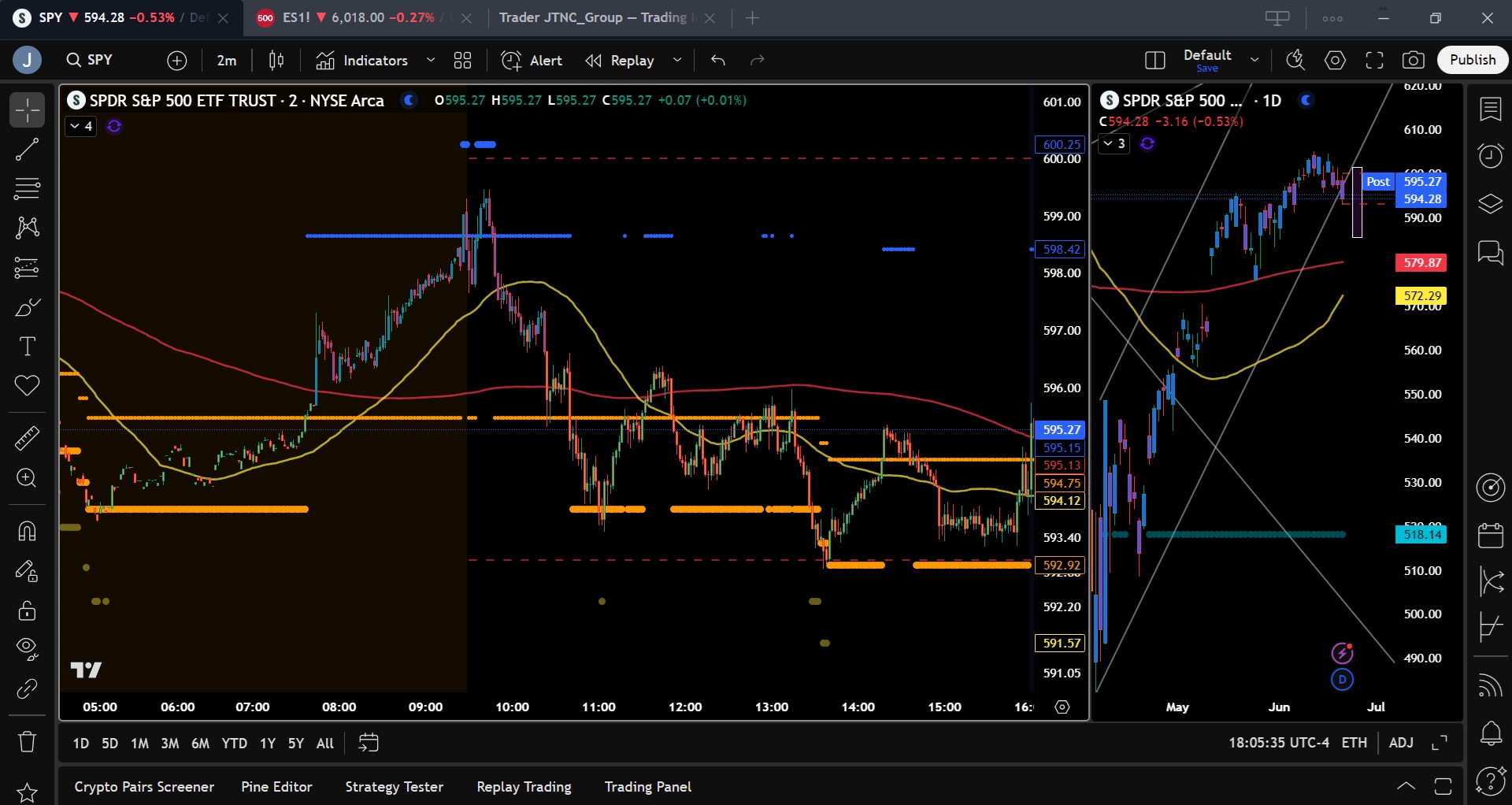 In Friday’s premarket analysis posted at 8:18 AM, SPY was trading at $596.64 with a bias level set at $598.75. The analysis stated that holding below this level would reflect market fragility and called for short setups targeting $596.35, followed by potential support zones at $594, $593, and a max downside near $590. On the flip side, the analysis noted that a break and hold above $598.75 could produce a rally toward $600 and possibly $604.25–$605. The tone leaned cautious, favoring shorts unless the market showed strength above the bias level.