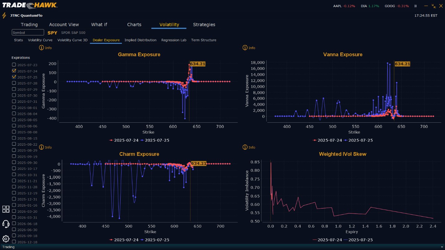 The model projects SPY’s maximum range for Thursday between $628.25 and $637.75, with the Call side dominating within a narrow, 5-point band suggesting choppy price action punctuated by occasional trending moves. Overnight, the market moved higher on favorable earnings and tariff news, with SPY opening at $631.55, right up against major resistance at $632. SPY briefly pulled back to key support at $630 before rallying midday, driven by news that 15% tariffs on Japan were being considered, widely seen as a win for U.S.-Japan relations. The ETF then consolidated throughout the afternoon before resuming its climb to new all-time highs, breaking above $635 intraday and closing at a record high of $634.21. Earnings strength and a calmer tariff environment continue to drive price action. The bulls remain firmly in control, with dip buyers consistently stepping in on even the slightest pullbacks. The new all-time high close reinforces the prevailing bullish trend, and there’s little indication the bulls are ready to cede ground. This bullish dominance has held since SPY reclaimed the $585 level. With a close near $635, bullish momentum is solidly intact, setting the stage for a potential push into the $635–$640 range, where we expect meaningful resistance and likely profit-taking. That said, tariff-related headlines remain a key risk. Should any negative developments surface, the tone could shift quickly, but in the absence of such surprises, the broader uptrend remains intact. Key resistance levels heading into Thursday are $636, $639, and $640, while major support lies at $628, $627, $625, and $622. Momentum favors continued upside, with near-term action likely to revolve around defending the $632 level. A healthy pullback to that area would offer bulls another opportunity to reset. Failure to hold $632 could prompt a retest of today’s lows at $630. A successful defense of $630 keeps the ultra-bullish scenario in play, with upside targeting $640. If $630 fails, the next critical support is $625. While we expect buyers to step in there, a decisive break below $625 opens the door to a deeper pullback toward $622 or even $620. Our model turns bearish below $622, and while the probability is low, a break below $600 would significantly raise the odds of a retest of the $585 level. Last week, early signs of potential weakness emerged as we approached August, but the strength of the past two sessions has reduced those risks. Any seasonal weakness may now be deferred to September or October. With SPY closing above the lower edge of a redrawn bullish channel from the April lows, the uptrend remains intact and strong. However, the $635–$639 resistance zone is dense and could moderate near-term upside. The market remains sensitive to macroeconomic data, bond yields, inflation readings, tariff developments, and fiscal policy changes. Notably, the VIX fell 6.79% to 15.38, reflecting a clear risk-on tone. We continue to recommend maintaining hedges on long books at these levels, particularly via 90-day out-of-the-money VIX calls, as we anticipate elevated volatility later this quarter.