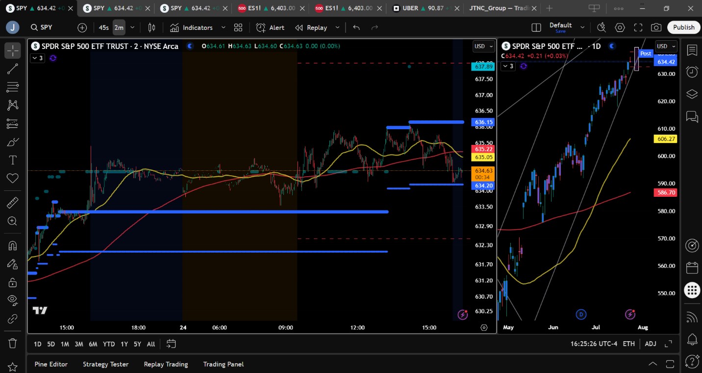In Thursday’s premarket analysis posted at 7:46 AM, SPY was trading at $634.87 with a bullish tone, supported by positive sentiment around AI earnings and trade progress. The analysis identified $632.50 as the bias level, favoring long entries above that point. Targets to the upside were $635, $638, and $640, while downside levels were $632.50, $630, and $628. The strategy advised dip buying near support and anticipated consolidation near $635 before any meaningful push higher. A break below $632.50 was expected to lead to short-term consolidation or a drift toward $630.
