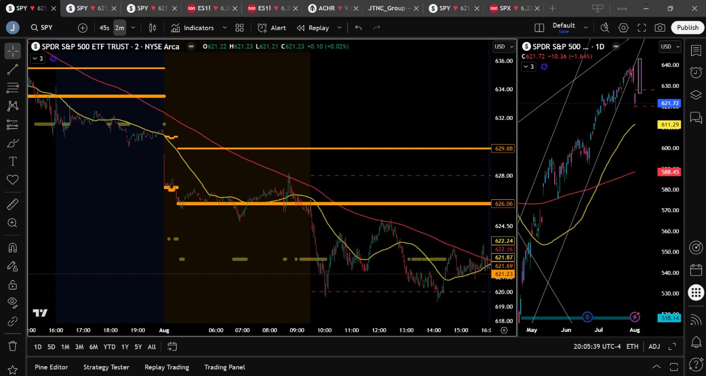 The premarket forecast proved spot-on as SPY never challenged the $628 bias level and quickly broke below $625. From there, it plunged to the next key downside target of $620, where it briefly stabilized before closing at $621.82. The market behaved exactly as projected: rallies failed, support was lost, and bearish momentum intensified. Traders who took short setups from $625–$628 and managed risk effectively had multiple opportunities to capitalize on the forecast. The warning to exit long trades and avoid chasing strength was critical, as intraday price action was one-directional and followed the script with precision.