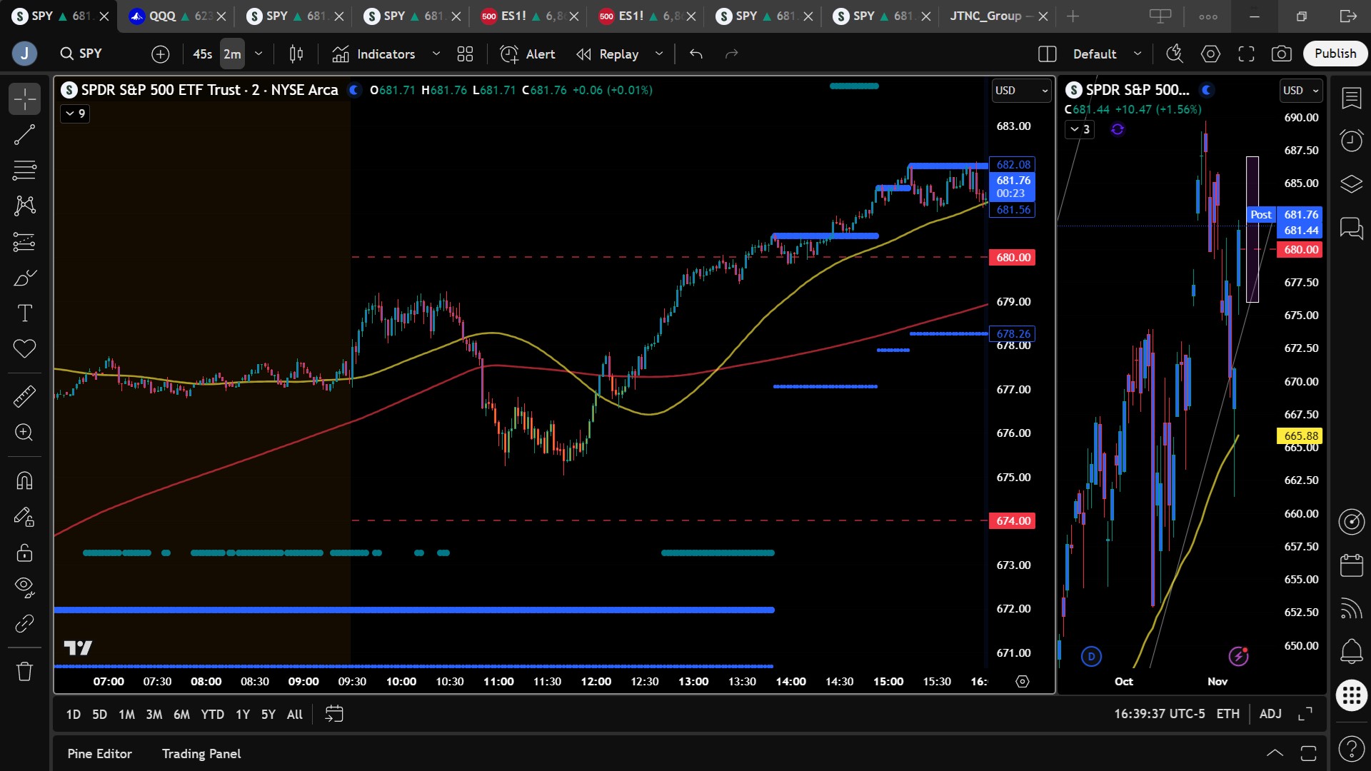 On Friday we wrote, “Sunday could produce a gap-and-go scenario, potentially pushing SPY back above $680,” and noted, “Monday may see the bulls attempt to build on Friday’s strong reversal, targeting $675 as the first step in reclaiming momentum from the bears,” while also adding, “Should SPY reclaim $680, the bulls will look to push toward $685 and $690.” With this context, and with the MSI opening in a bullish state after a strong overnight gap higher and extended targets printing above, our only focus was to find a clean long setup off support. A well-formed double bottom before noon at $675 provided the exact opportunity we were looking for right in line with our plan to reclaim $680 as the next objective. We entered long and set T1 at the premarket level of $678, which was achieved smoothly. With momentum clearly favoring the bulls, we set T2 at another premarket level at $680, aligning perfectly with our projected target zone. Both targets were hit before 2 pm, leaving us in a strong position heading into the afternoon. From there, we simply moved our stop to breakeven and let the trade develop. Around 3 pm, extended targets stopped printing, signaling exhaustion in the move, so we locked in profits just below $682, wrapping up the session with a one-and-done trade to start the week. It was a textbook execution of our plan, driven by patience, discipline, and flawless alignment between MSI signals, market structure, and our broader trading framework. The MSI continues to prove its reliability as the cornerstone of our trading process.