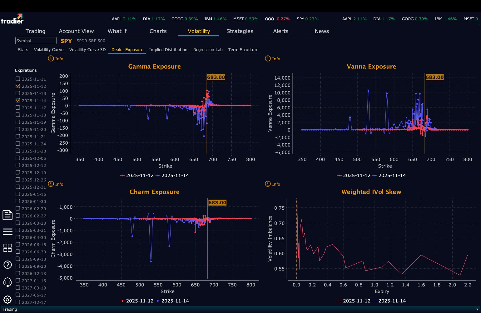SPY’s projected maximum range for Wednesday sits between $677.25 and $688.25, with the Call side dominating in a narrow band that signals choppy price action punctuated by brief trending periods. There’s no economic data due Wednesday, leaving the ongoing government shutdown as the main driver of market sentiment and direction. Traders should continue to anticipate headline-driven volatility. Today the market extended its rally, closing up 0.23%, once again demonstrating the power of the prevailing bull trend and how quickly sentiment can flip when even modestly positive developments emerge from Washington. SPY has now fully recovered from last week’s sell-off, finishing at $683, well above the critical $680 level where the bulls maintain firm control of the tape. Volume came in below average, leaving some doubt about the conviction behind the move, but price remains king and momentum continues to favor the bulls. While the bears briefly gained traction last week, their efforts were short-lived, consistent with nearly every pullback seen this year. As long as SPY holds above $640, the broader bull trend remains structurally intact, and the bears have significant ground to recover before regaining any meaningful influence. Overnight, bulls will look to defend $680 to sustain the rally toward $685, where a brief pause or dip may develop before the next leg higher. Should $680 fail, SPY could retrace to $677, but holding that level keeps the door open for further upside toward $685, followed by consolidation ahead of a potential breakout to $690 and new all-time highs. Absent a catalyst, resistance for Wednesday sits at $684, $685, $688, and $690, with support at $682, $677, $675, and $672. A strong move above $685 could accelerate momentum, while a decisive break below $672 could expose $666 before more significant support emerges. Crypto fell sharply today while most Mag stocks advanced, creating a mixed, bifurcated market that warrants close monitoring for signs of underlying strength or weakness. As we’ve noted repeatedly, sustained softness in key leadership names or crypto could still spark the 10–15% correction we’ve been tracking, though today’s action once again pushed that risk further out. As long as leadership remains broadly intact, the path of least resistance continues to point higher. The VIX fell 1.82% to 17.28, reflecting renewed confidence and positioning consistent with a potential Santa rally. SPY closed well above the lower boundary of its bull channel from the April lows, and given last week’s brief break of that structure, the channel will likely be redrawn to align with the market’s evolving slope, tempering its trajectory while preserving the long-term bullish framework, which remains intact though increasingly tested.
