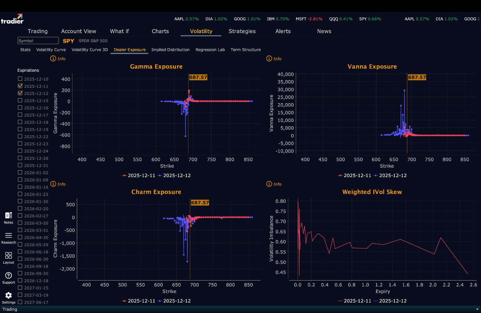 Dealers are selling SPY $688 to $710 and higher strike Calls indicating the Dealers’ belief that prices may not rise too much the rest of the week. The ceiling for the week appears to be $695. To the downside, Dealers are buying $687 to $565 and lower strike Puts in a 4:1 ratio to the Calls they’re selling, reflecting a market that is not overly concerned about lower prices. For the week Dealer positioning is unchanged from slightly bearish to slightly bearish. We advise reviewing Dealer positioning daily for directional clues. These positions evolve quickly and tracking them is essential for staying ahead of shifting market sentiment.