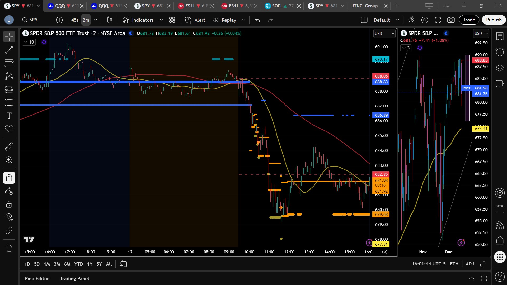 The market’s actual behavior did a good job of validating the key structure from the premarket blueprint, even though the eventual downside extension went a bit further than the base case. After the open, SPY moved up into the $688–$689 region and effectively tagged the first upside target near $688.85 before stalling, exactly the kind of behavior we flagged as a warning that consolidation might begin. From there, price rolled over and cleanly lost the $686.35 bias level, kicking off a sustained move lower that sliced through the next downside targets at $684.85 and $683.85 and moved into the $682.35 area. While the analysis suggested that the decline would likely remain relatively shallow, the slide continued a bit beyond our final premarket level, ultimately touching $679.17 before buyers stepped in. Even so, the roadmap around the bias level and the initial target structure worked well: traders watching for a stall near the upper target had a high-quality short or risk-off inflection, and those respecting the bias level saw that once $686.35 failed, the focus shifted from buying every dip to respecting the emerging downside momentum. The fact that price interacted meaningfully with nearly every premarket level underscores the value of those levels for intraday decision-making.