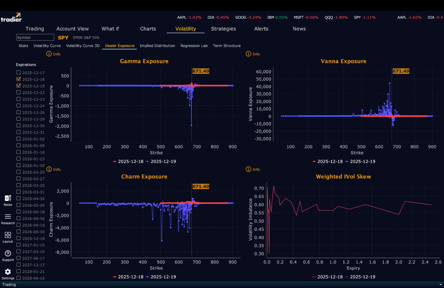 SPY’s projected maximum range for Thursday is between $665 and $681, with the Put side dominating in an expanding band that signals trending price action with intermittent chop. The market moved lower today, falling more than 1%, with SPY closing down 1.10% at $671.40 and finishing near the lows of the session. Volume was once again significantly above average. Overnight, bulls pushed price back above $680 into the open, but the move failed quickly. Once the market opened, selling was persistent throughout the day. While the downtrend lacked momentum, the close near the lows gives bears control of the near-term narrative. Price is well below $685, the level where bulls regain full control, confirming a bearish near-term shift. We warned that failure to hold $680 would embolden bears, and that scenario has now played out. Despite this, the longer-term trend still favors bulls, keeping the broader battle intact. Overnight, a failure to hold $670 opens the door to $664 and then $662. If bulls manage even a dead cat bounce and hold above $670, they will attempt to reclaim $675, though we expect the first and possibly second tests to be sold. Bulls need a close above $675 to regain balance and reenter the $675–$685 range that has defined the past two weeks. External catalysts such as CPI could change conditions quickly, so remain alert to geopolitical headlines and trade what you see. The 50 DMA at $675 slowed today’s decline but failed to stop it, reinforcing our view that durability on future tests remains uncertain. Today’s action reduces the odds of a Santa Rally, though it does not eliminate the possibility. Resistance for Thursday sits at $672, $675, $677, and $680, while support rests at $670, $664, and $662. Gains above $680 should be capped by heavy resistance, while a break below $667 could send price toward $662 quickly. The broader trend remains bullish above $640, but bulls have lost their near-term edge. Bears are now in control, so absent a catalyst, we prefer shorts near $675 and cautious longs near $670 as the market remains under pressure. Crypto fell today, as did all MAG stocks except Netflix, a combination we have warned could pressure equities if sustained. The VIX rose 6.92% to 17.62, remaining neutral, though acceleration toward 20 would signal increasing risk. SPY closed near the lower boundary of its bull trend channel from the April lows, with support near $668.